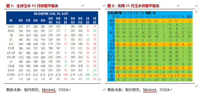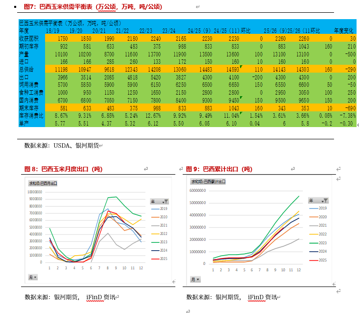 11月USDA报告相对稳定,全球玉米供应宽松,2025年11月USDA报告全球玉米产量环比减少,但同比增加较多,需求增加。25/26年度11月全球玉米产量预期12.86亿吨,略低于上月12.87亿吨,高于去年同期12.31亿吨,同比增5550万吨。其中饲用玉米消费8.13亿吨,高于去年7.87亿吨,国内总消费12.84亿吨,高于去年的12.50亿吨,预计期末库存2.81亿吨,低于去年的2.92亿吨,库销比21.91%。其中美国产量4.26亿吨,饲用1.55亿吨,食用及工业消费1.77亿吨(乙醇用酒精1.42亿吨),出口7811万吨。巴西产量1.31亿吨,饲用6600万吨,食用工业消费3050万吨,出口4300万吨。阿根廷产量5300万吨吨,出口3700万吨。乌克兰产量3200万吨,出口2450万吨。25/26年度新季玉米产量处于高位,全球供应宽松。
