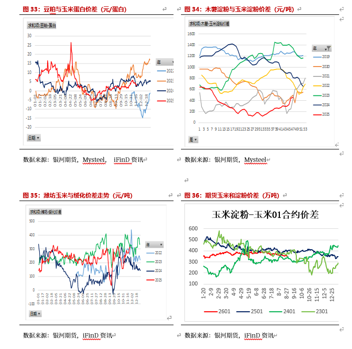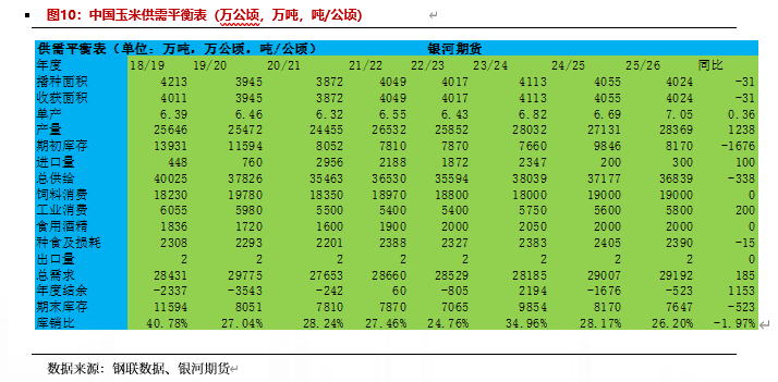 根据我们最新玉米供需平衡表,产量增加较多,需求会略下降,但玉米结转库存仍较大,玉米供应仍偏紧。25/26年度地租下降,单产提高,全国产量增加较多。根据调研数据,东北黑龙江地租平均下降70元/亩,但单产高于去年,按照单产1850斤/亩的产量(比去年增10%左右),折算到港平仓价基本在1900-2000元/吨。根据钢联调研数据,25/26年度玉米产量为28245万吨,比上年度增加1114万吨。但根据我们的调研及数据,我们认为东北单产在10%左右,东北产量增加1000万吨左右,华北考虑到收获时降雨影响,预计产量与去年持平,西北地区产量增加200万吨左右,预期全国玉米产量增加1200万吨左右。