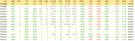 PTA期货12个合约,远月继续维持偏高价格,但近远月合约之间价差有所收窄,收缩至100元/吨以下。