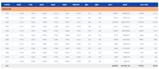 期货12个合约,全天各合约涨跌不一。品种持仓量486451手,较上一交易日增加24144手,其中活跃合约硅铁SF2603,持仓量增加19308手。