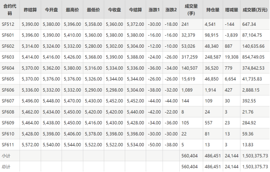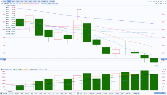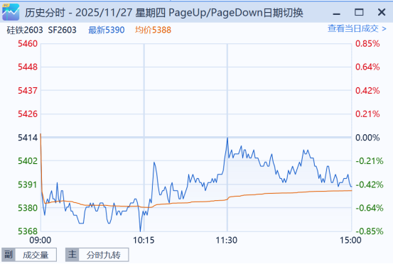 11月27日期货品种硅铁SF2603合约呈现震荡下行态势。日盘开于5416元/ 吨,最高价5426元/ 吨,最低价5368元 / 吨,收盘价为5390元/吨,结算价为 5388元/ 吨,较前一交易日下跌24元/吨。全日成交量为317259手,持仓量为248587手。