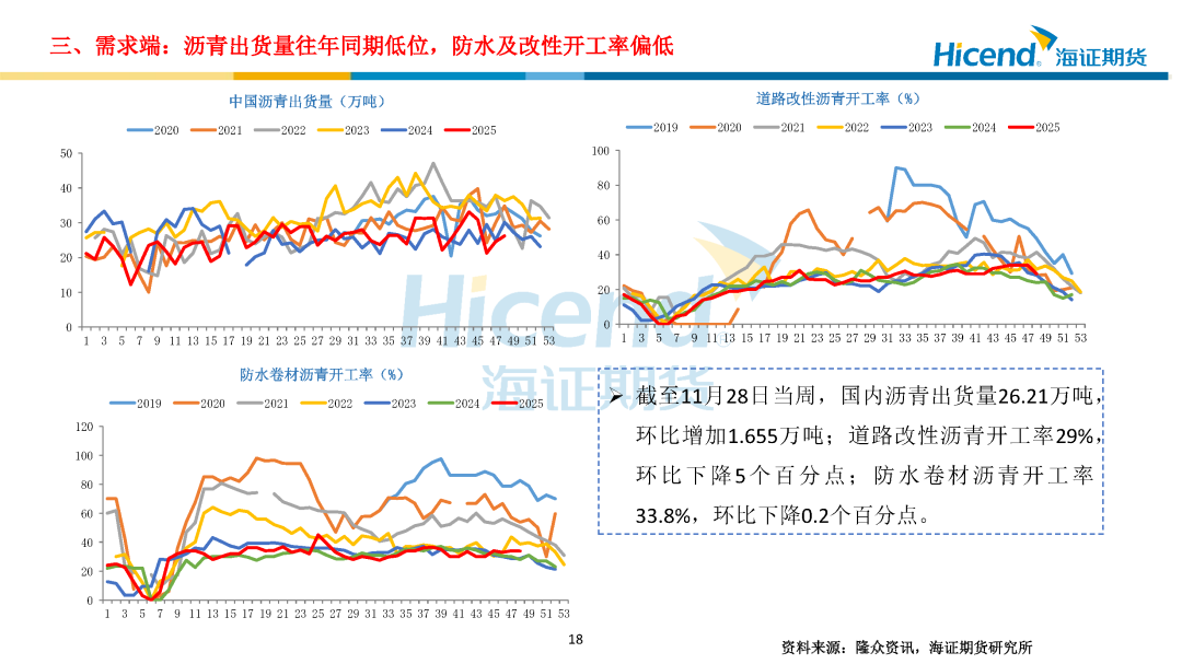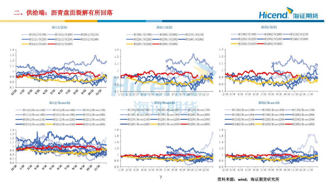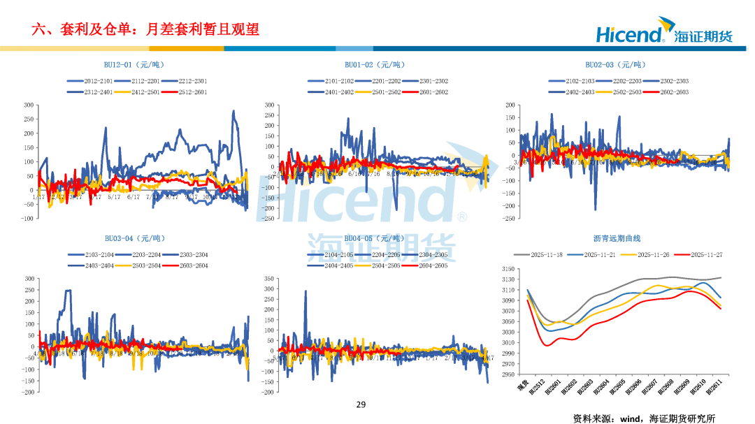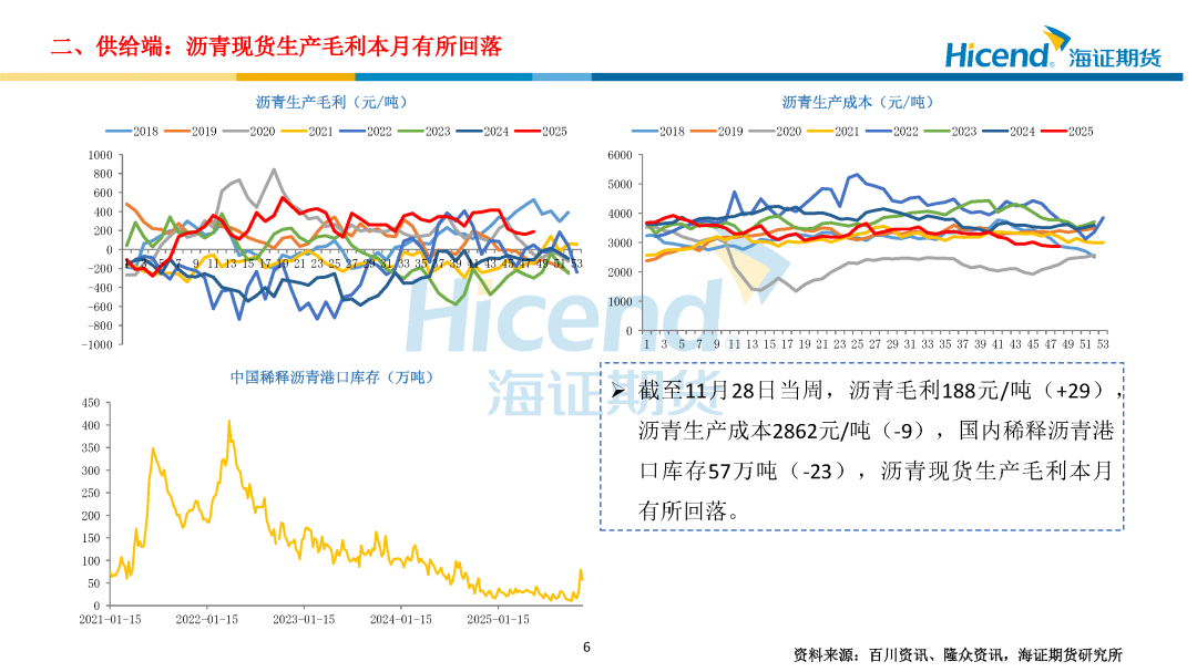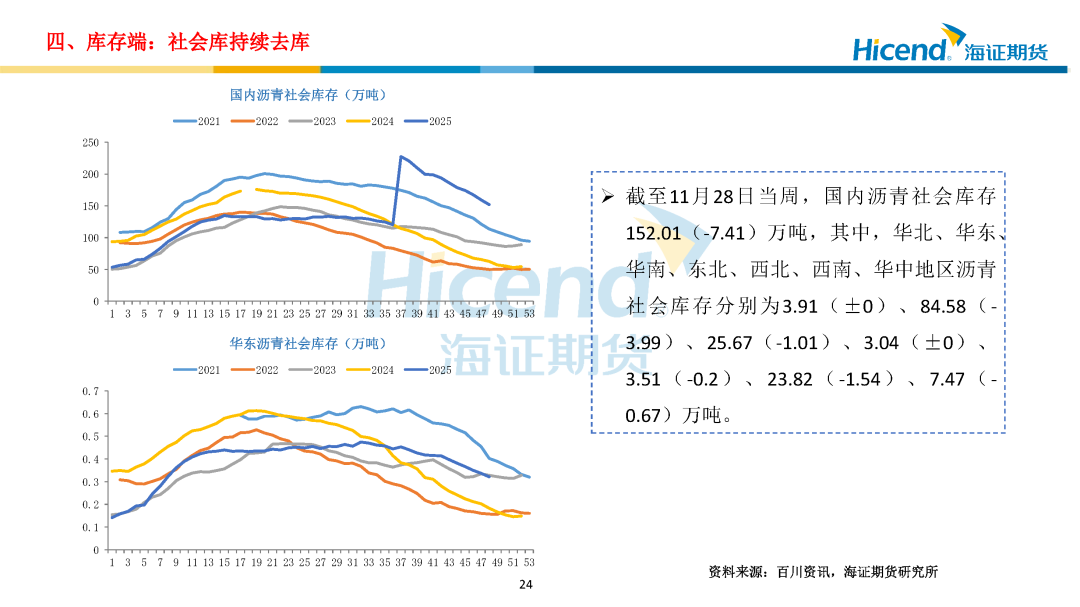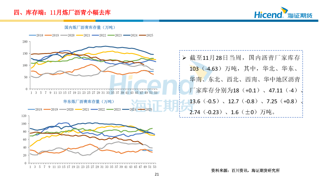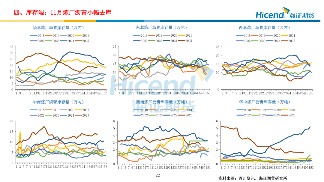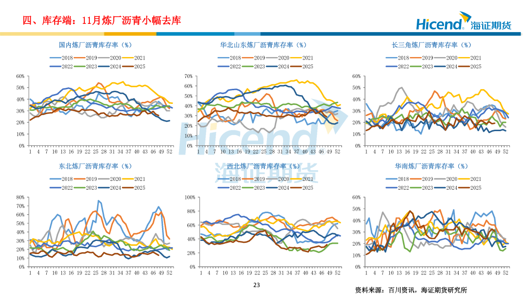库存端:11月炼厂沥青小幅去库,社会库继续去库。我们预计,12月沥青将延续季节性去库。