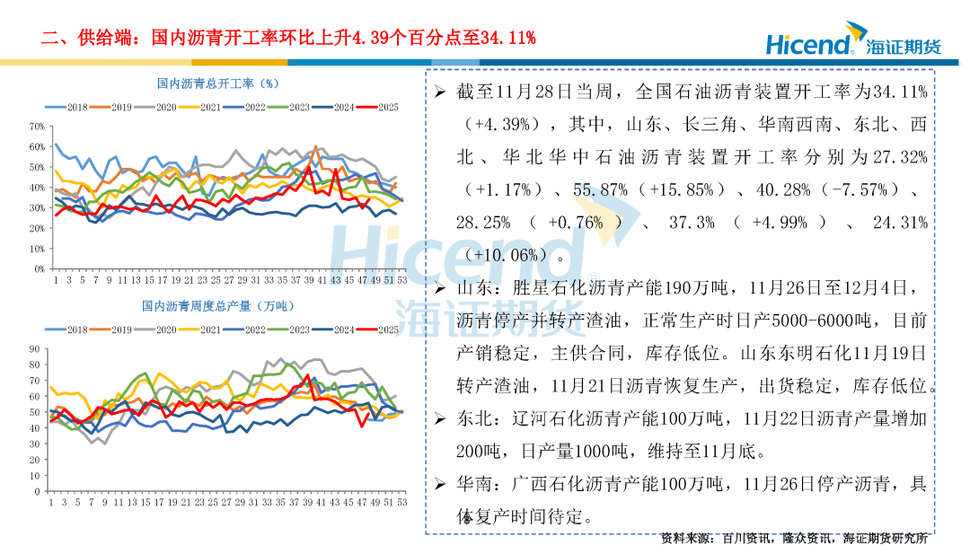 供应端:沥青产能暂无变化,维持在7921万吨,11月,胜星石化26日至12月4日沥青停产并转产渣油,东明石化19日转产渣油,21日沥青恢复生产,辽河石化22日起沥青产量增加200吨至月底,广西石化26日停产沥青。12月,云南石化继续停产检修,因生产效益一般,中石油部分炼厂停产沥青;广州石化12月沥青复产,扬子石化暂无沥青排产计划,茂名石化、齐鲁石化沥青保持低产,中石化排产增量主要集中在华东,为赶年度计划或个别炼厂焦化装置负荷调整;中海四川自10月下旬开工后,沥青产量逐步趋稳,泰州石化原料略有减少,中海油排产略有减少;地炼原料充足,有锁价合同待交付,另外,焦化效益好,部分炼厂转产渣油,叠加部分炼厂检修停产,地炼排产环比小幅下滑,12月沥青整体排产同环比均变化不大。我们预计,国内沥青12月总供应将环比下降2.78%至244.04万吨。