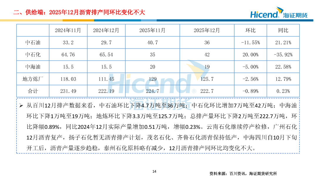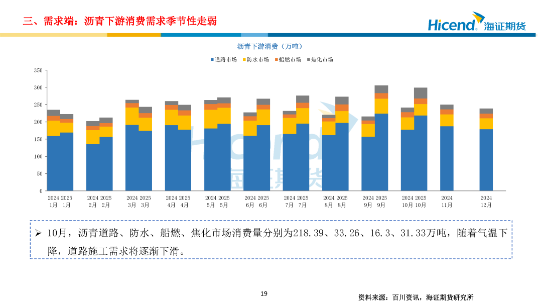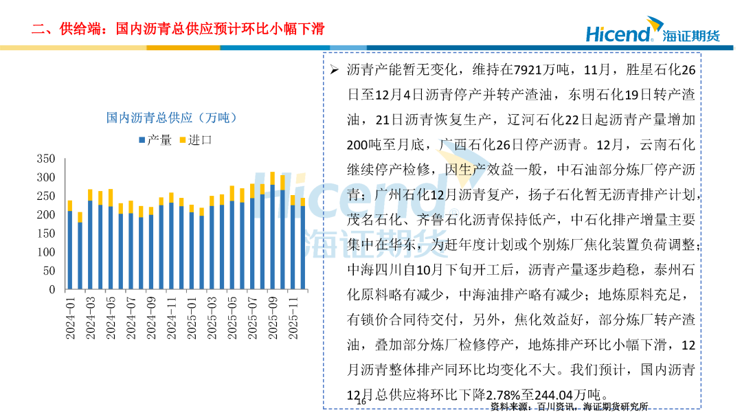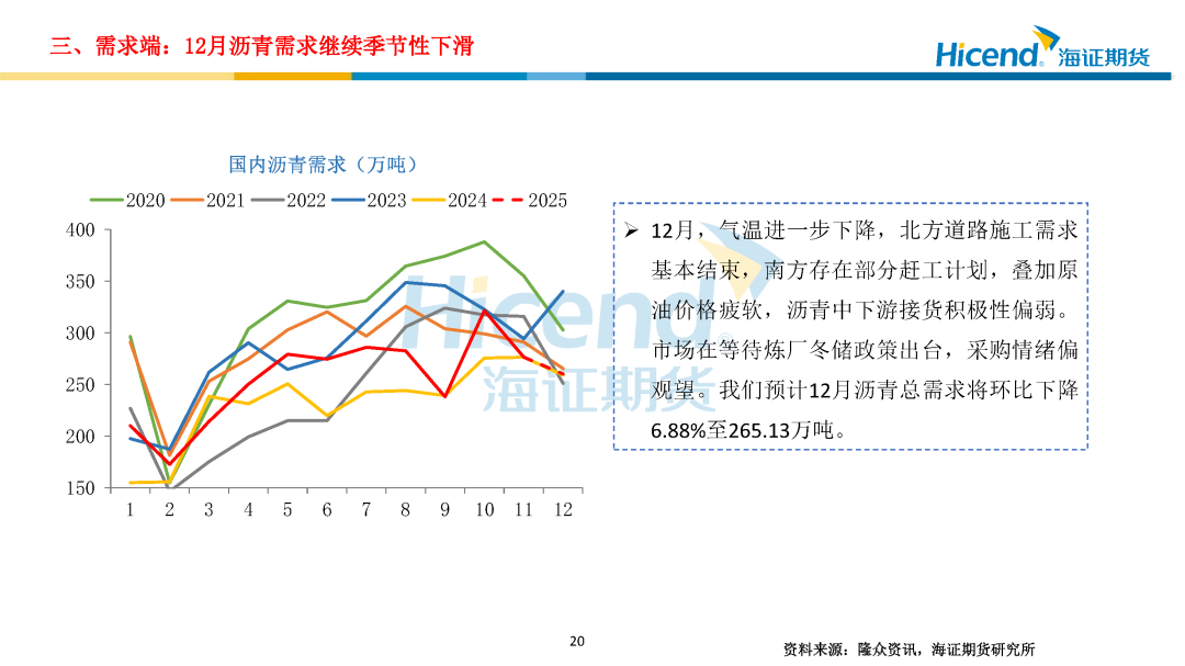 需求端:12月,气温进一步下降,北方道路施工需求基本结束,南方存在部分赶工计划,叠加原油价格疲软,沥青中下游接货积极性偏弱。市场在等待炼厂冬储政策出台,采购情绪偏观望。我们预计12月沥青总需求将环比下降6.88%至265.13万吨。