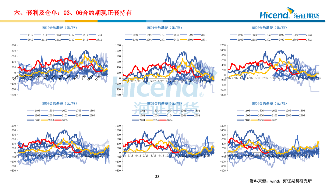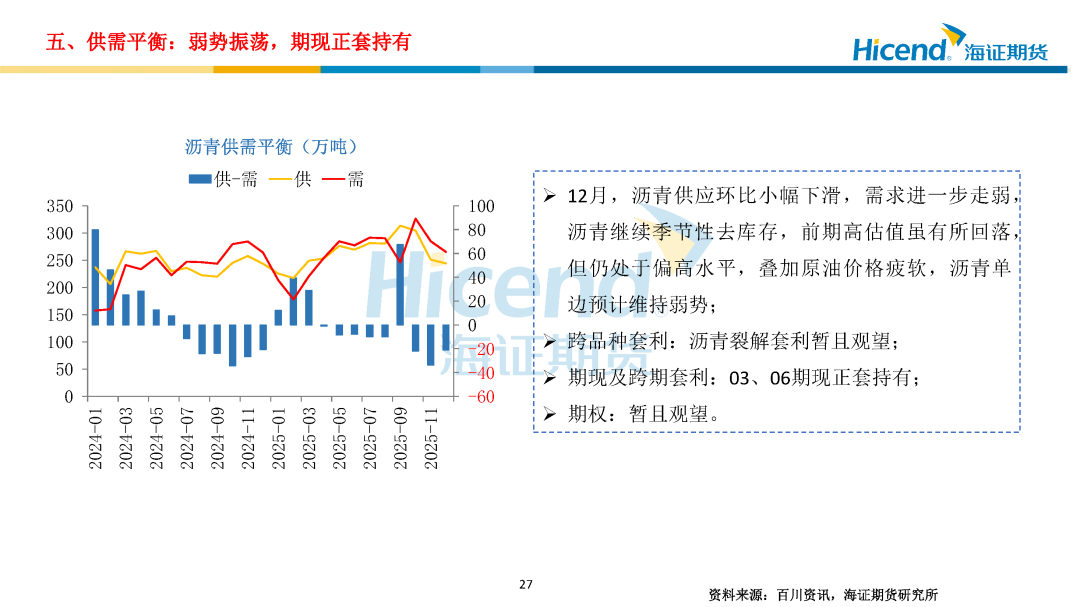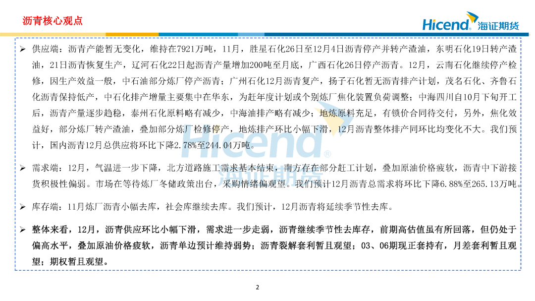 整体来看,12月,沥青供应环比小幅下滑,需求进一步走弱,沥青继续季节性去库存,前期高估值虽有所回落,但仍处于偏高水平,叠加原油价格疲软,沥青单边预计维持弱势;沥青裂解套利暂且观望;03、06期现正套持有,月差套利暂且观望;期权暂且观望。