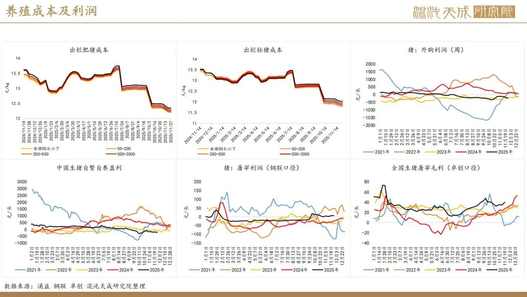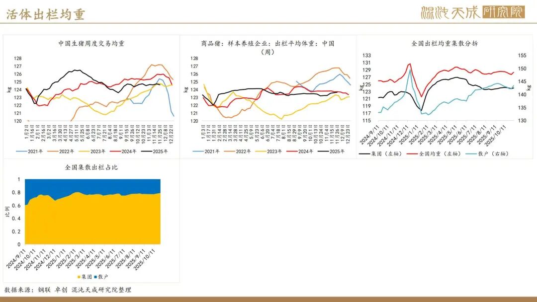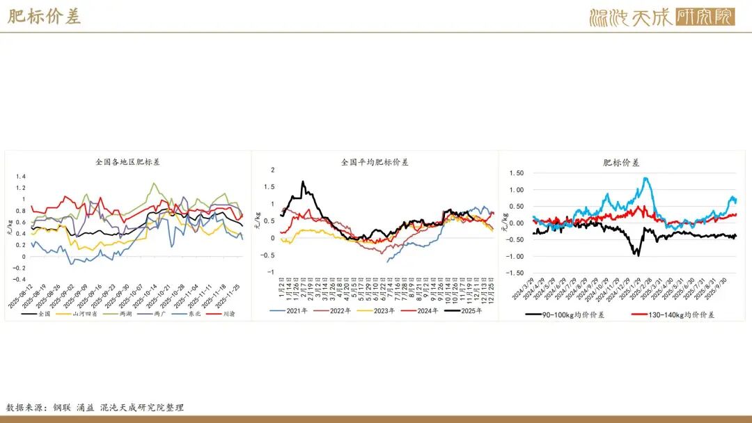 多数市场供应充足,屠宰企业采购较为顺畅,无明显压力,少数省份头部减量,影响屠企报价情绪,但采购计划相对正常。近期集团出栏体重相对稳定,山东因积极出栏稍有微降趋势,河南存在进度偏快企业跌价期对抗动作,但北方相对均重维持120-125公斤,东北偏大2公斤,四川高于北方7-10公斤;社会猪场近期普遍出栏大体重猪,北方多为匹配南方开启的腊需求。