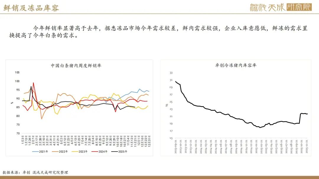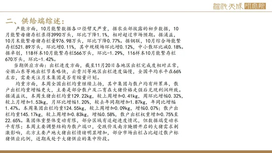 当期供应方面:出栏进度方面,截至11月20日各地区出栏完成度相对正常,安徽山东等地出栏节奏略快,云贵川等地区出栏进度偏慢,全国平均水平在66%左右,需要关注月末集团是否有缩量计划。