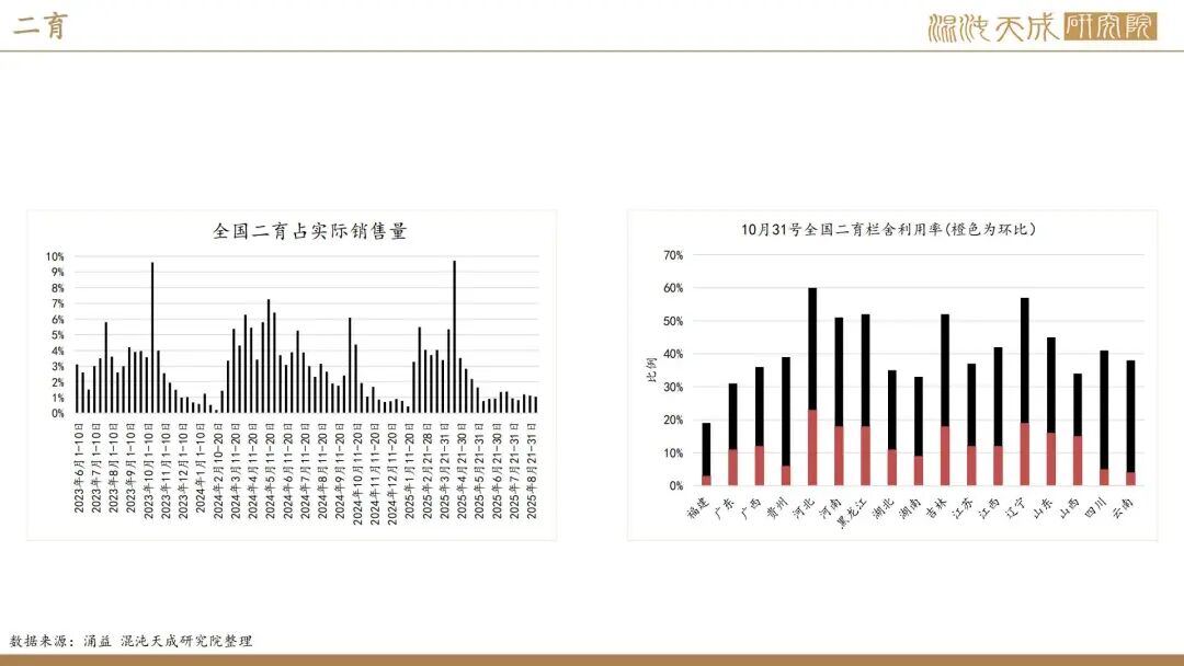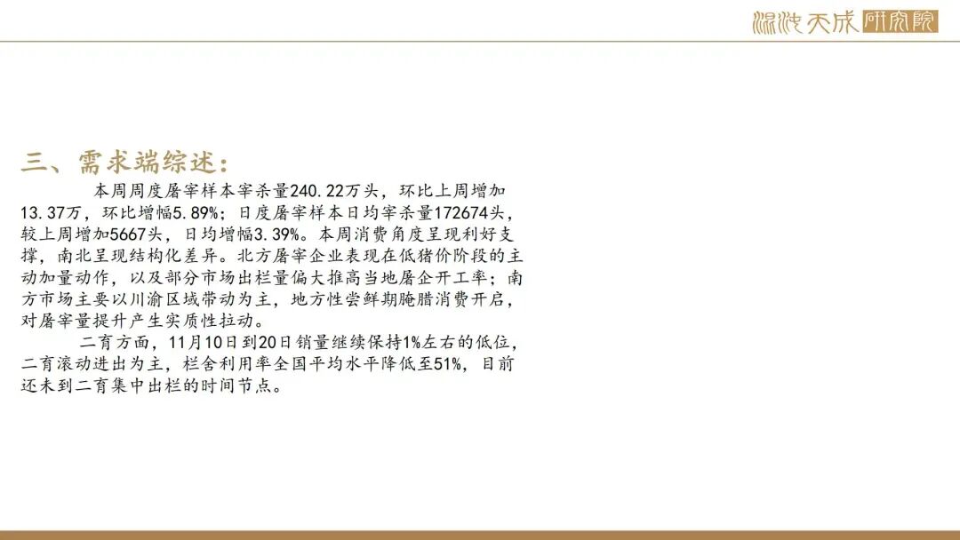 本周周度屠宰样本宰杀量240.22万头,环比上周增加13.37万,环比增幅5.89%;日度屠宰样本日均宰杀量172674头,较上周增加5667头,日均增幅3.39%。本周消费角度呈现利好支撑,南北呈现结构化差异。北方屠宰企业表现在低猪价阶段的主动加量动作,以及部分市场出栏量偏大推高当地屠企开工率;南方市场主要以川渝区域带动为主,地方性尝鲜期腌腊消费开启,对屠宰量提升产生实质性拉动。二育方面,11月10日到20日销量继续保持1%左右的低位,二育滚动进出为主,栏舍利用率全国平均水平降低至51%,目前还未到二育集中出栏的时间节点。