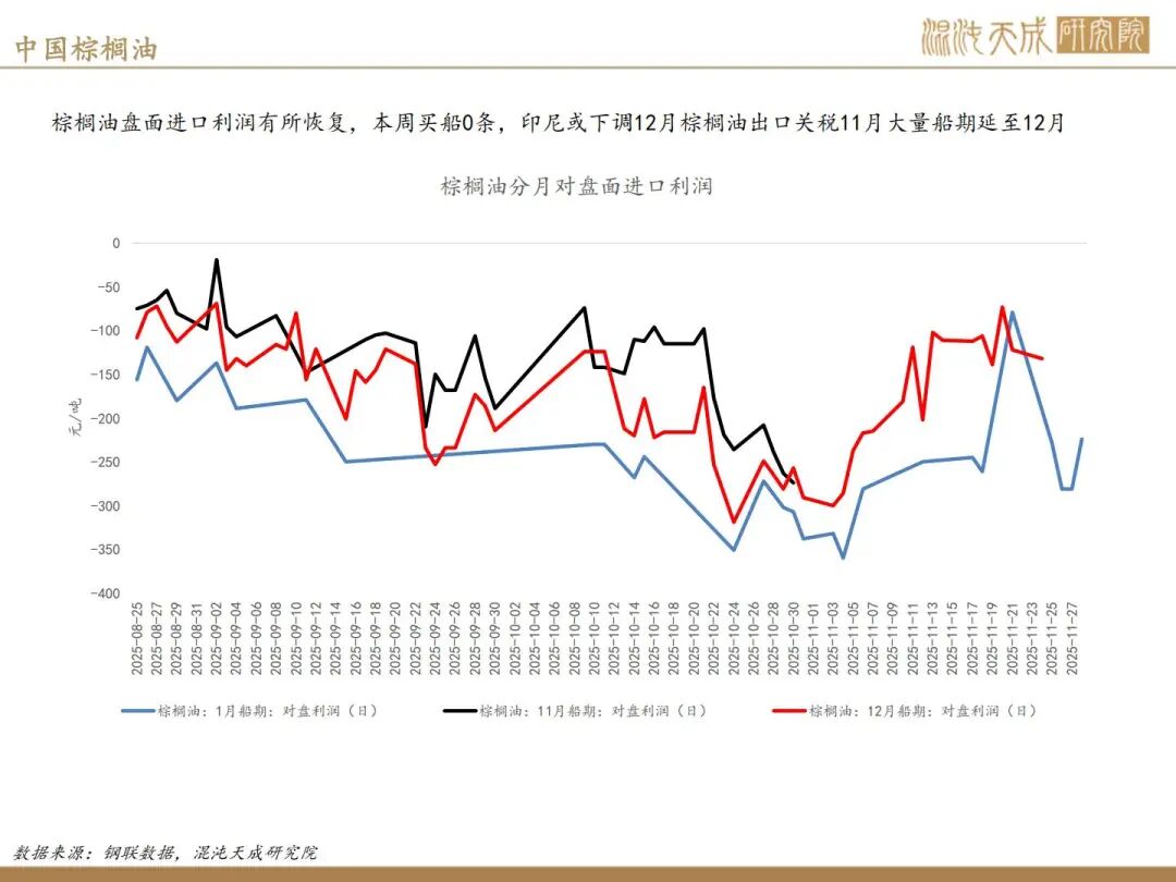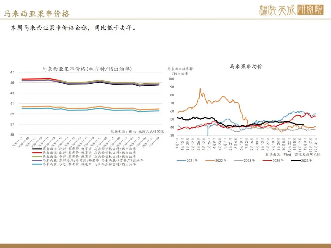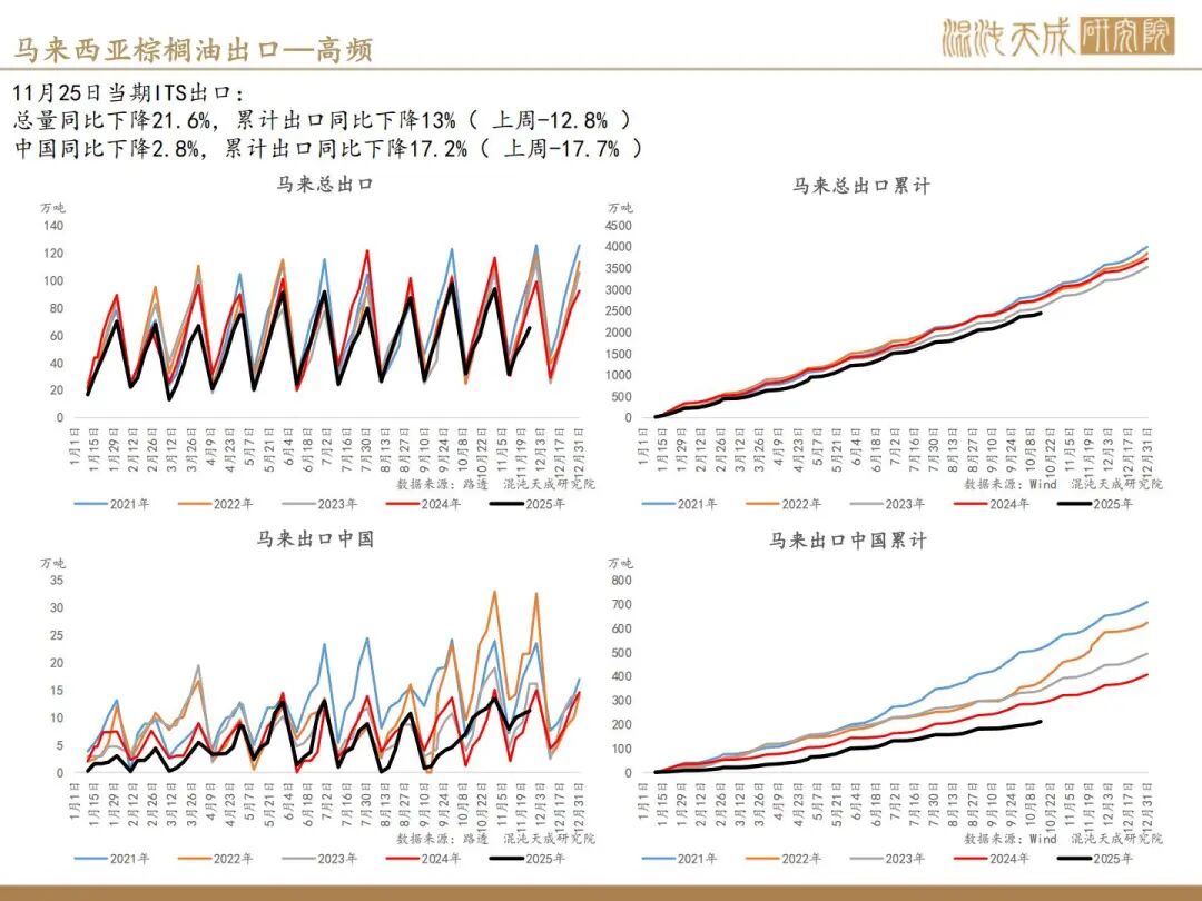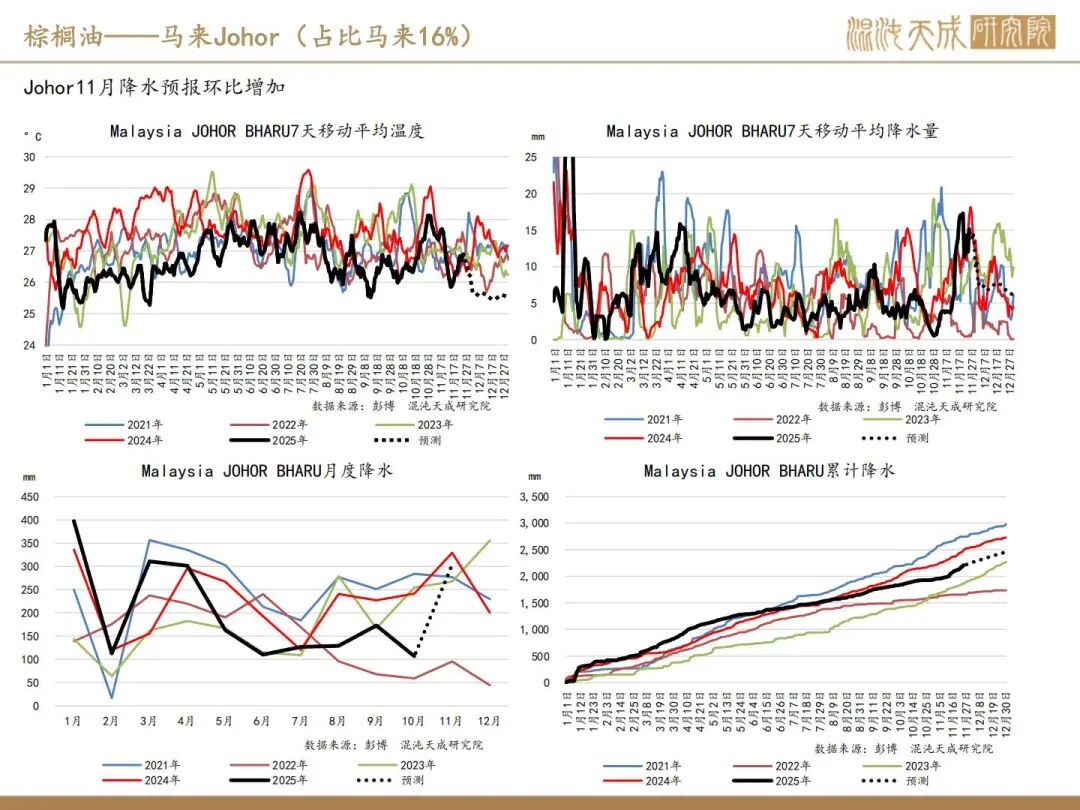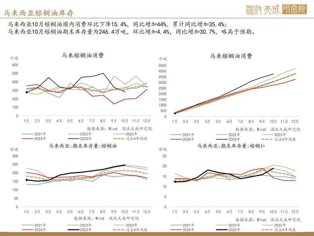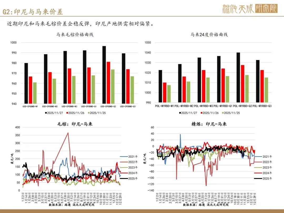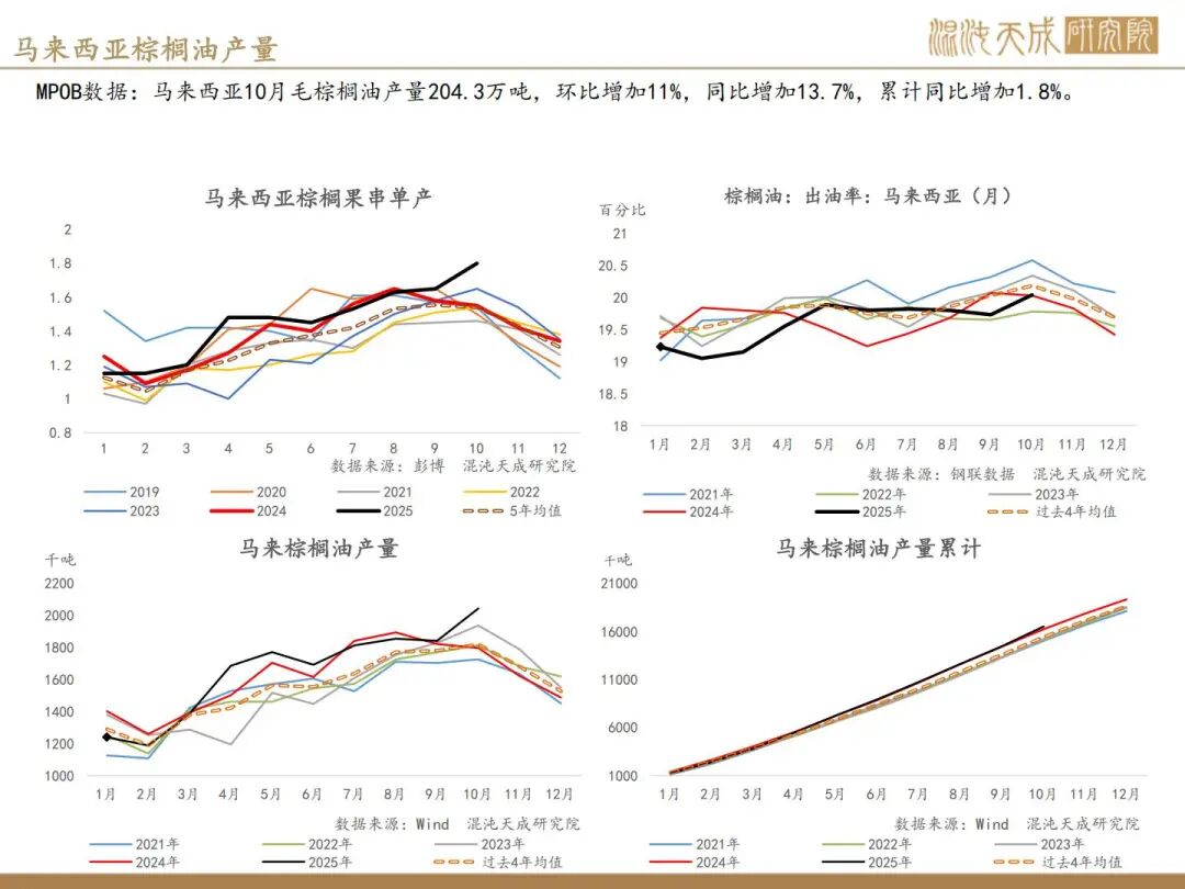 供给端:GAPKI发布数据显示,印尼9月出口了220万吨棕榈油,低于今年8月所出口的348万吨;9月印尼毛棕榈油产量393万吨,环比下降22.4%,同比下降2.7%,印尼9月期末库存259.2万吨,环比增加1.93%;MPOA发布数据,马来西亚11月1-20日棕榈油产量预估增加3.24%;SPPOMA数据显示,2025年11月1-25日马来西亚棕榈油单产环比增加3.34%,出油率环比增加0.41%,产量环比上月同期增加5.49%;据AmSpec,马来西亚11月1-25日棕榈油出口量为987978吨,较上月同期减少16.4%;ITS数据显示,马来西亚11月1-25日棕榈油出口量为1041935吨,较上月同期减少18.8%;印尼政府正在考虑从明年起建立总计60万公顷(约148万英亩)的新棕榈油种植园,以提高产量;马来西亚贸易和行业官员:在有利的天气条件、改善的劳动力供应以及高产量的新种植园的支持下,马来西亚的毛棕榈油产量预计将在2025年首次超过2000万吨,同比增长3.4%;受有利天气影响,GAPKI预计印尼2025年棕榈油产量将增长10%;印尼林业小组计划从9月1日起,对约427万公顷(1.055万英亩)林区内未获得许可运营的矿山进行打击,工作小组已经于3月启动了所谓的“纪律行动”,打击非法棕榈油生产,并派遣军方人员接管了逾330万公顷种植园。