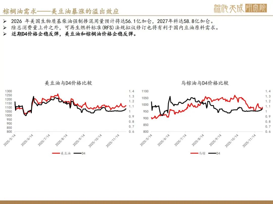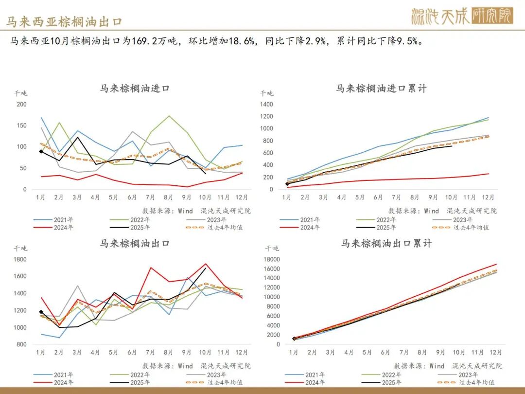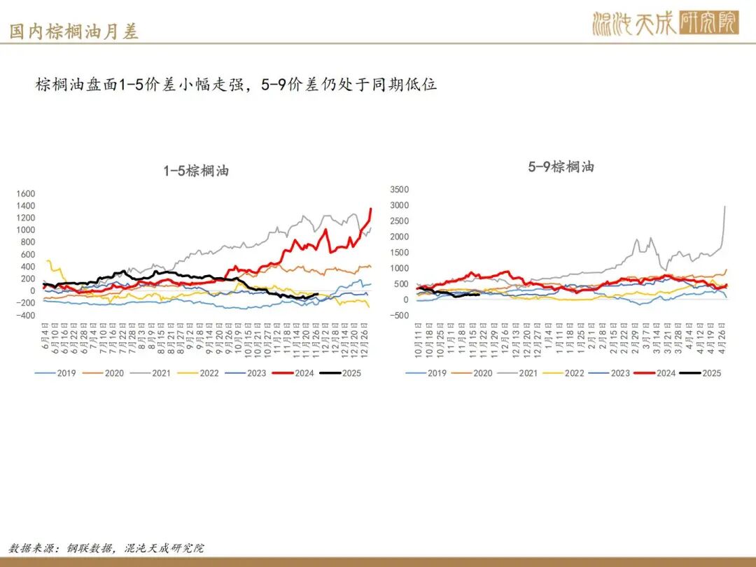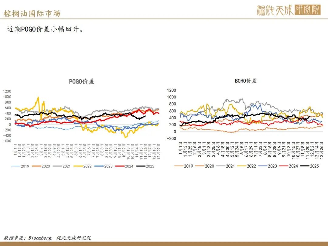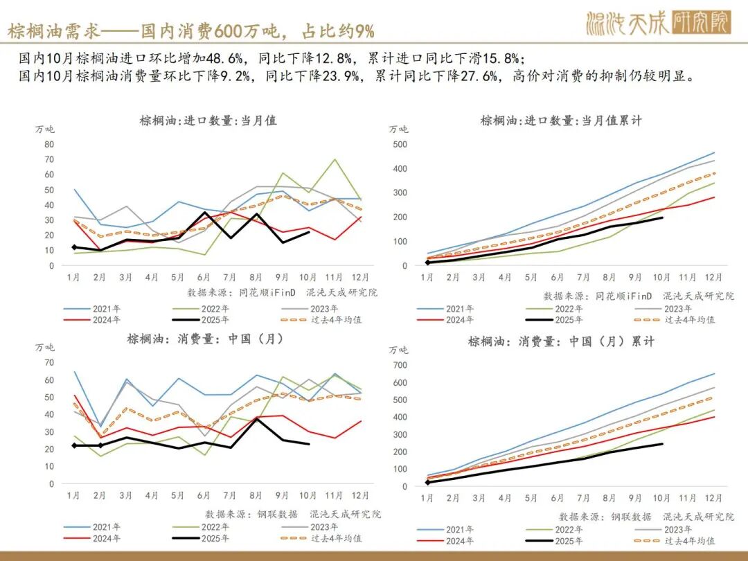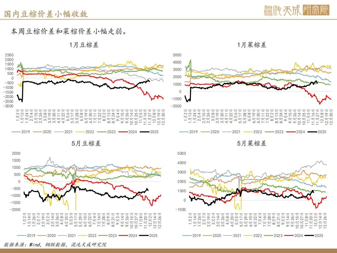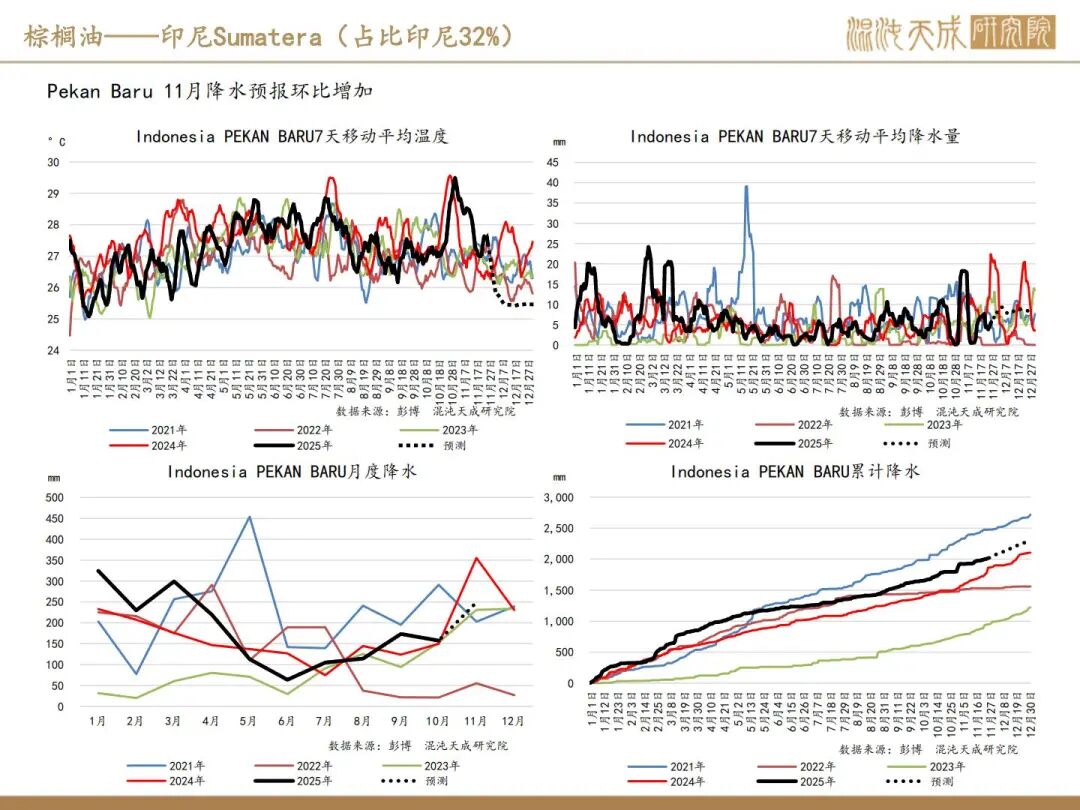 供给端:GAPKI发布数据显示,印尼9月出口了220万吨棕榈油,低于今年8月所出口的348万吨;9月印尼毛棕榈油产量393万吨,环比下降22.4%,同比下降2.7%,印尼9月期末库存259.2万吨,环比增加1.93%;MPOA发布数据,马来西亚11月1-20日棕榈油产量预估增加3.24%;SPPOMA数据显示,2025年11月1-25日马来西亚棕榈油单产环比增加3.34%,出油率环比增加0.41%,产量环比上月同期增加5.49%;据AmSpec,马来西亚11月1-25日棕榈油出口量为987978吨,较上月同期减少16.4%;ITS数据显示,马来西亚11月1-25日棕榈油出口量为1041935吨,较上月同期减少18.8%;印尼政府正在考虑从明年起建立总计60万公顷(约148万英亩)的新棕榈油种植园,以提高产量;马来西亚贸易和行业官员:在有利的天气条件、改善的劳动力供应以及高产量的新种植园的支持下,马来西亚的毛棕榈油产量预计将在2025年首次超过2000万吨,同比增长3.4%;受有利天气影响,GAPKI预计印尼2025年棕榈油产量将增长10%;印尼林业小组计划从9月1日起,对约427万公顷(1.055万英亩)林区内未获得许可运营的矿山进行打击,工作小组已经于3月启动了所谓的“纪律行动”,打击非法棕榈油生产,并派遣军方人员接管了逾330万公顷种植园。