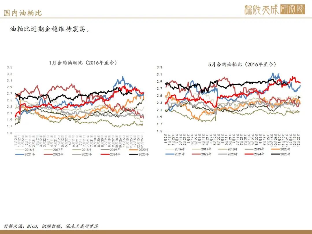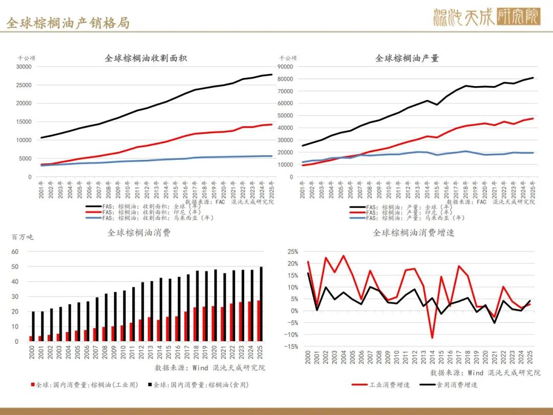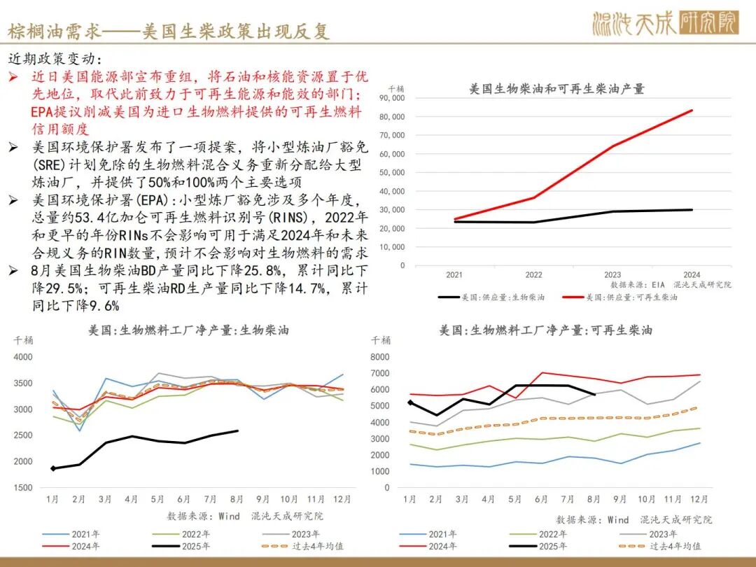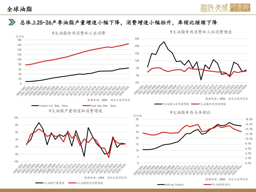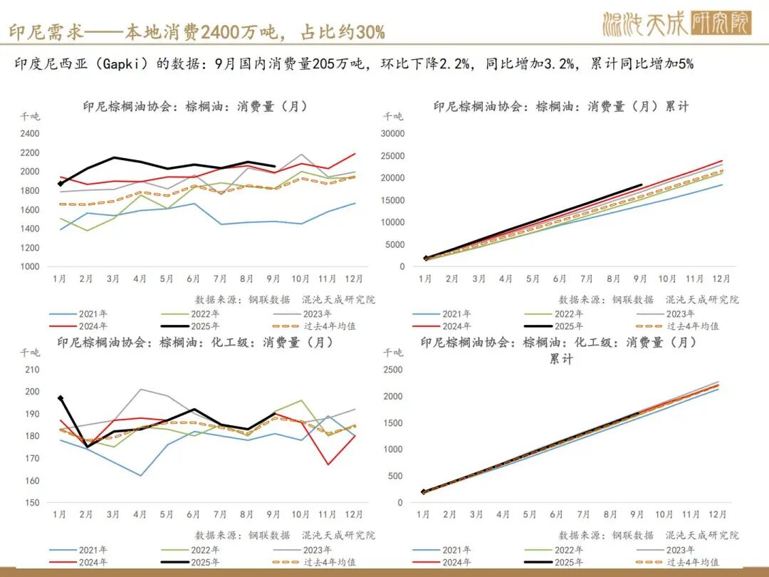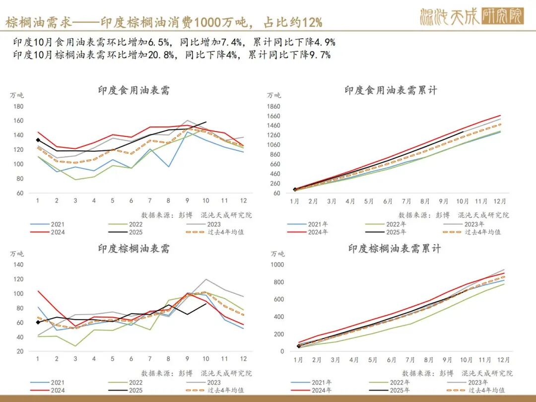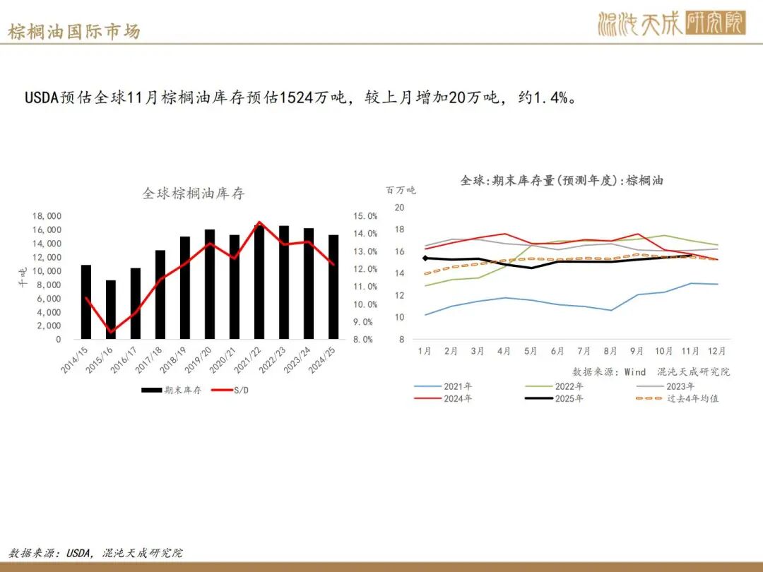供给端:GAPKI发布数据显示,印尼9月出口了220万吨棕榈油,低于今年8月所出口的348万吨;9月印尼毛棕榈油产量393万吨,环比下降22.4%,同比下降2.7%,印尼9月期末库存259.2万吨,环比增加1.93%;MPOA发布数据,马来西亚11月1-20日棕榈油产量预估增加3.24%;SPPOMA数据显示,2025年11月1-25日马来西亚棕榈油单产环比增加3.34%,出油率环比增加0.41%,产量环比上月同期增加5.49%;据AmSpec,马来西亚11月1-25日棕榈油出口量为987978吨,较上月同期减少16.4%;ITS数据显示,马来西亚11月1-25日棕榈油出口量为1041935吨,较上月同期减少18.8%;印尼政府正在考虑从明年起建立总计60万公顷(约148万英亩)的新棕榈油种植园,以提高产量;马来西亚贸易和行业官员:在有利的天气条件、改善的劳动力供应以及高产量的新种植园的支持下,马来西亚的毛棕榈油产量预计将在2025年首次超过2000万吨,同比增长3.4%;受有利天气影响,GAPKI预计印尼2025年棕榈油产量将增长10%;印尼林业小组计划从9月1日起,对约427万公顷(1.055万英亩)林区内未获得许可运营的矿山进行打击,工作小组已经于3月启动了所谓的“纪律行动”,打击非法棕榈油生产,并派遣军方人员接管了逾330万公顷种植园。