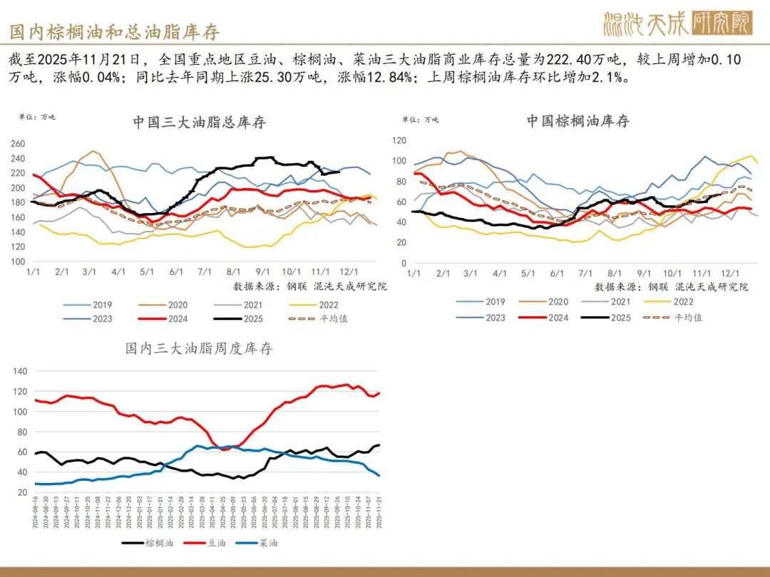 需求端:欧洲议会支持将《欧盟零毁林法案》实施推迟一年;近日美国能源部宣布重组,将石油和核能资源置于优先地位,取代此前致力于可再生能源和能效的部门;EPA提议削减美国为进口生物燃料提供的可再生燃料信用额度;印尼能源部官员表示,截至11月10日,该国今年生物柴油消费量已达1225万千升,印尼政府已为2025年生物柴油消费分配了1560万千升的FAME用量;多个矿业协会正在请求印度尼西亚政府取消在2026年实施50%混合生物柴油(B50)的计划,引发市场对B50计划的顺利实施和棕榈油未来需求的担忧;马来年底前启动可持续航空燃料生产、国内消费预期增加;据巴西国家能源政策委员会(CNPE)官员,巴西将生物柴油在柴油中的强制掺混比例从14%上调至15%;本周累计买船0条,上周国内棕榈油库存环比增加2.1%。