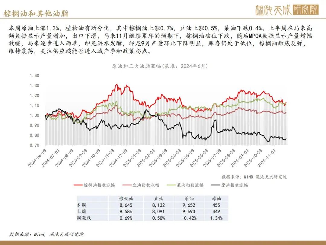本周原油上涨1.3%,植物油有所分化,其中棕榈油上涨0.7%,豆油上涨0.5%,菜油下跌0.4%。上半周在马来高频数据显示产量增加,出口下滑,马来11月继续累库的预期下,棕榈油破位下跌,随后MPOA数据显示产量增幅放缓,马来逐步进入雨季,印尼洪水发酵,印尼9月产量环比下降明显,库存仍处于低位,棕榈油触底反弹,维持震荡,关注供应端能否进入减产季和政策拐点。