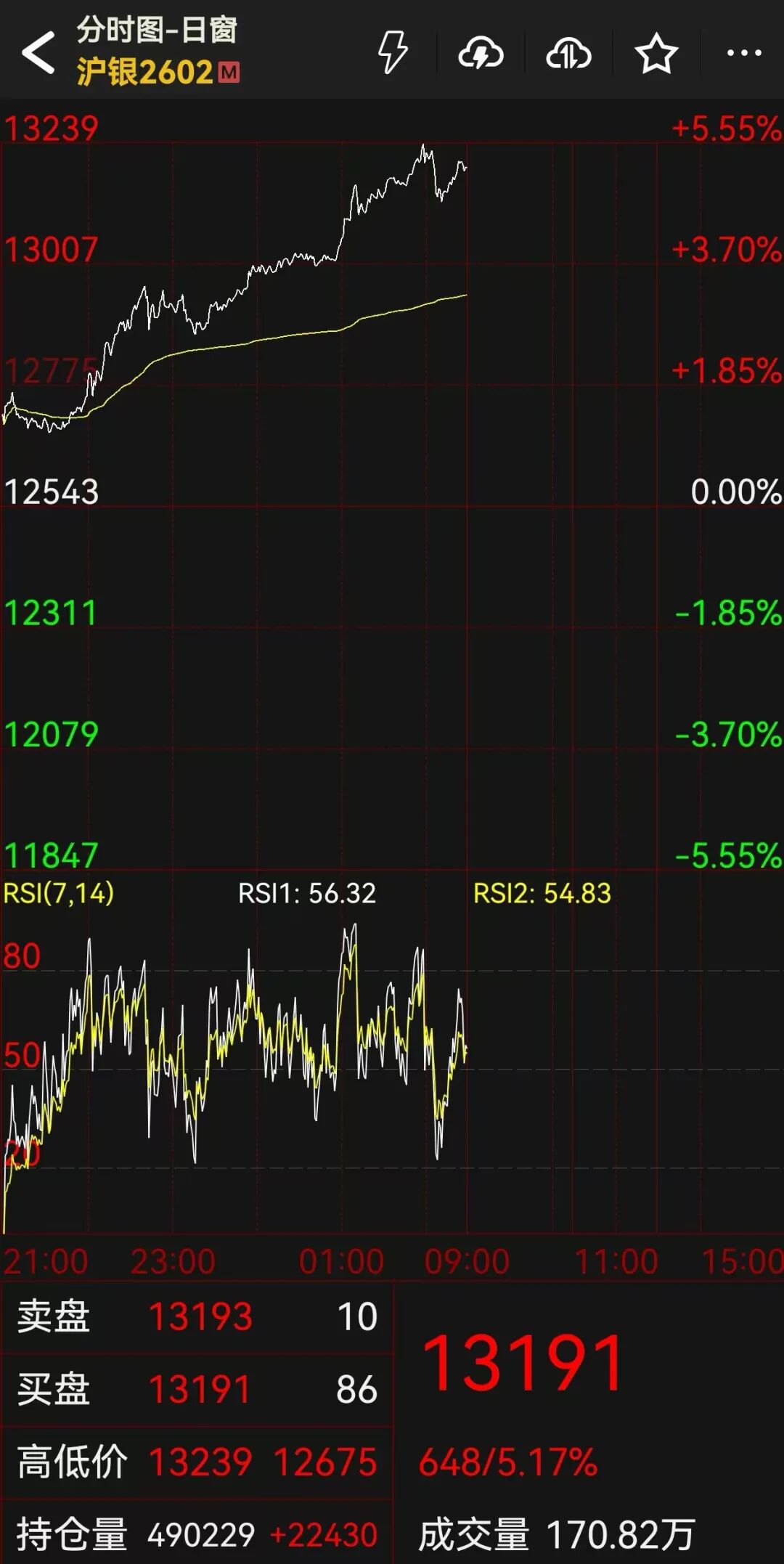 国内市场同步跟进,文华财经数据显示,11月28日夜盘交易时段,沪银期货主力合约盘中再创新高至13239元/千克,涨超5%。