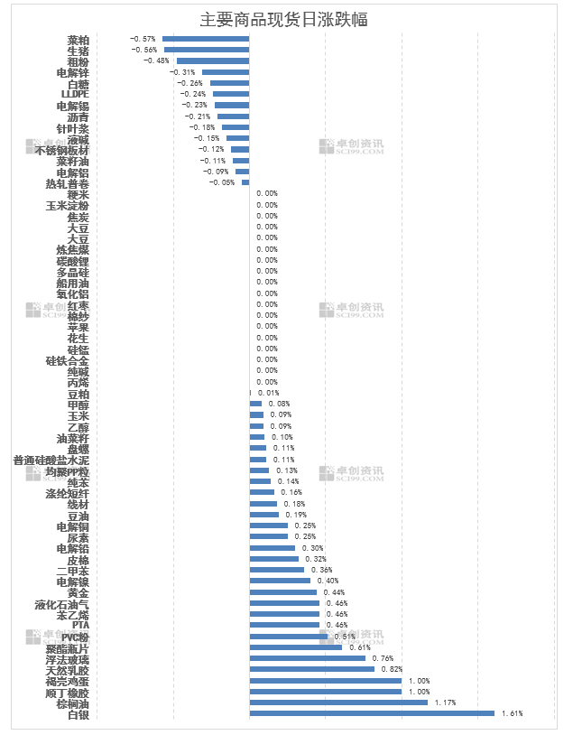 11月28日,卓创资讯监测商品现货市场30种上涨、14种下跌,18种企稳。能化板块多数品种走强;农产品板块涨跌分化,鸡蛋延续上涨,菜粕、生猪等品种承压下跌;黑色板块整体偏弱,线材微涨,粗粉、热轧普卷等品种下跌;建材板块走势平稳。(价格涨跌幅均以卓创资讯监测现货商品均价或主流市场价格计算)