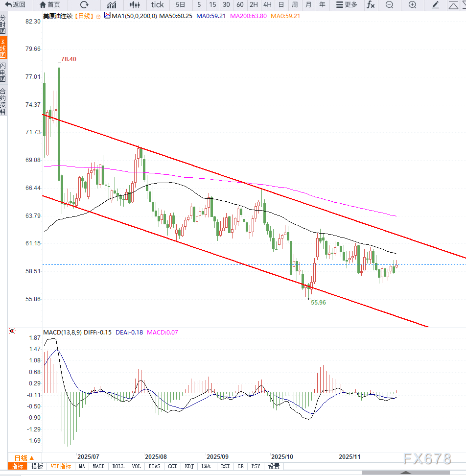 当前WTI美原油日线级别走势呈现“下跌趋势中的震荡修复”特征:趋势结构上:价格仍运行在主要下行趋势线下方,均线系统(如20日与60日)呈空头排列,显示中期趋势尚未扭转。
