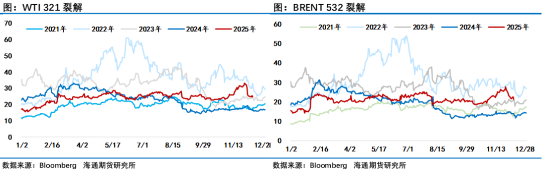 油价周五尾盘出现了快速回落行情匆匆结束了11月的交易,周五美国芝商所(CME)因技术问题导致交易暂停大半天,让原本因感恩节假期流动性不足的盘面更容易出现大波动,而周末美国特朗普的特使威特科夫将与赴美的乌克兰代表团举行会谈,市场担心出现意外情况,资金有离场观望意愿。最终在经过了一个月的震荡拉锯走势后,WTI 1月原油期货收报58.55美元/桶,11月份累计下跌超过3.38%。布伦特1月原油期货收报63.20美元/桶,11月份累跌超2.42%,至此油价已经连续第四个月收跌。这期间月差先跌后涨,成品油裂解差则是先涨后跌,反映出则后期间在对俄制裁和美国推动俄乌和平给市场带来的影响导致投资者观点的摇摆。