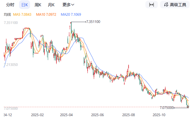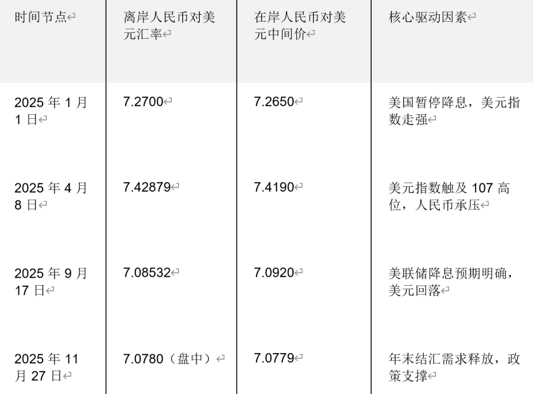 从年度走势看,美元兑人民币呈现“先抑后扬再突破”的节奏。年初受美国暂停降息、美元指数高位震荡影响,离岸人民币以1美元对7.27开局,4月8日触及年内低点7.4288;此后随着美联储降息预期升温,美元指数从107的高位回落至102附近,人民币开启升值通道,9月17日首次“破7.1”至7.08532;11月以来,叠加年末结汇需求释放,人民币进一步突破7.09、7.08关键关口,年度升值幅度已超4%。