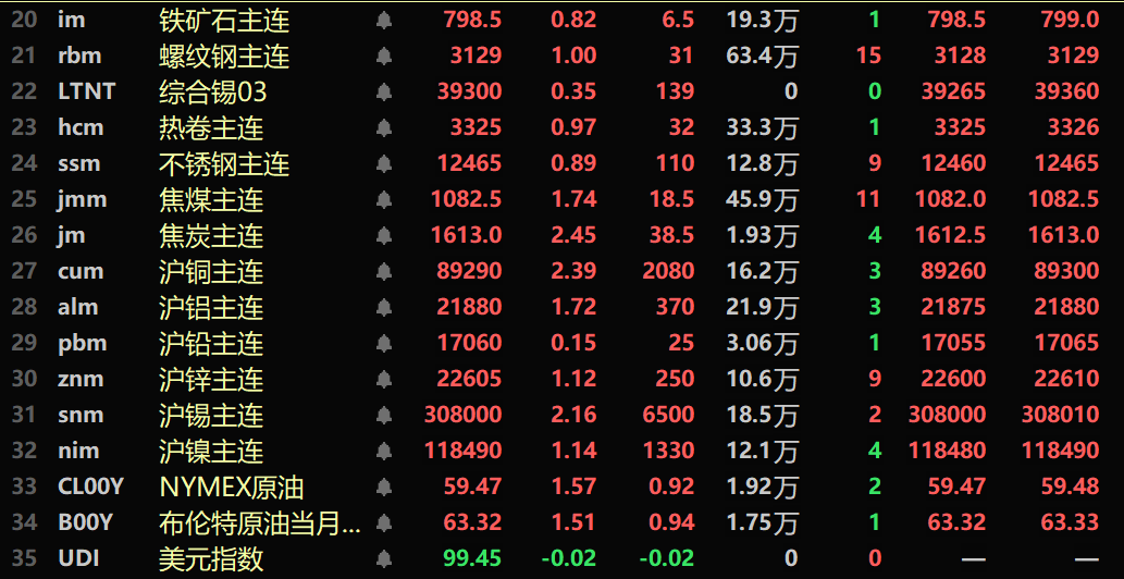 黑色系均飘红,铁矿涨0.82%,螺纹涨1%,热卷涨0.97%,不锈钢涨0.89%。双焦方面:焦煤主力合约涨1.74%,焦炭主力合约涨2.45%。