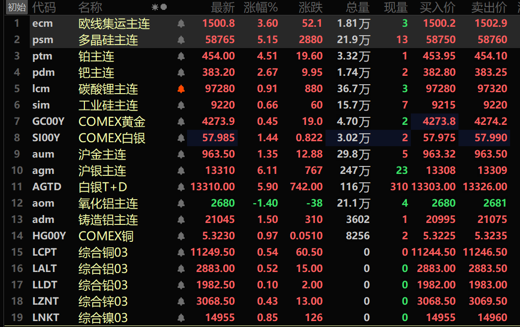 此外,铸造铝主连期货涨1.5,氧化铝主连跌1.4%。碳酸锂主连涨0.91%。工业硅主连涨0.66%。多晶硅主连涨5.15%。
