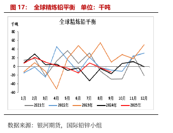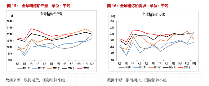 根据国际铅锌小组数据显示:2025年9月全球精炼铅产量108.82万吨,同比-0.25%;1-9月累计产量986.14万吨,累计同比+2.13%。9月全球铅消费110.11万吨,同比-0.6%;1-9月累计消费量984.64万吨,累计同比+1.76%。9月全球铅短缺1.29万吨,1-9月累计过剩1.5万吨。