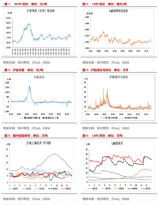 11月初,国内再生铅冶炼企业仍处复产进程中,国内铅锭社会库存仍处低位,沪铅价格呈现偏强震荡走势。临近交割,国内社会库存未见显著累库,叠加多头资金涌进,沪铅价格迅速拉升,沪铅2601合约一度涨至17815元/吨。随交割结束,多头资金离场;再生铅复产、提产进程加快的背景下,沪铅价格持续回落。临近月底,考虑到消费逐渐转淡,含铅废料回收商畏跌心理下出现抛售;含铅废料价格出现下行,再生铅冶炼成本有所下移,沪铅价格或仍有进一步下行空间。