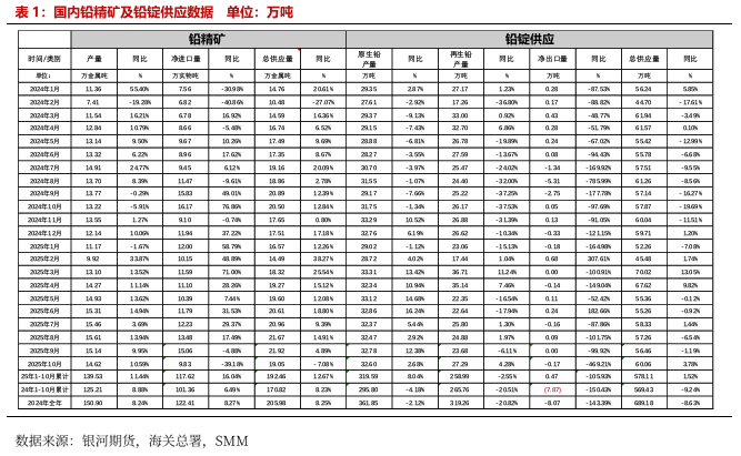 根据SMM数据显示:10月国内铅精矿产量14.62万金属吨,环比-3.43%,同比+10.59%。