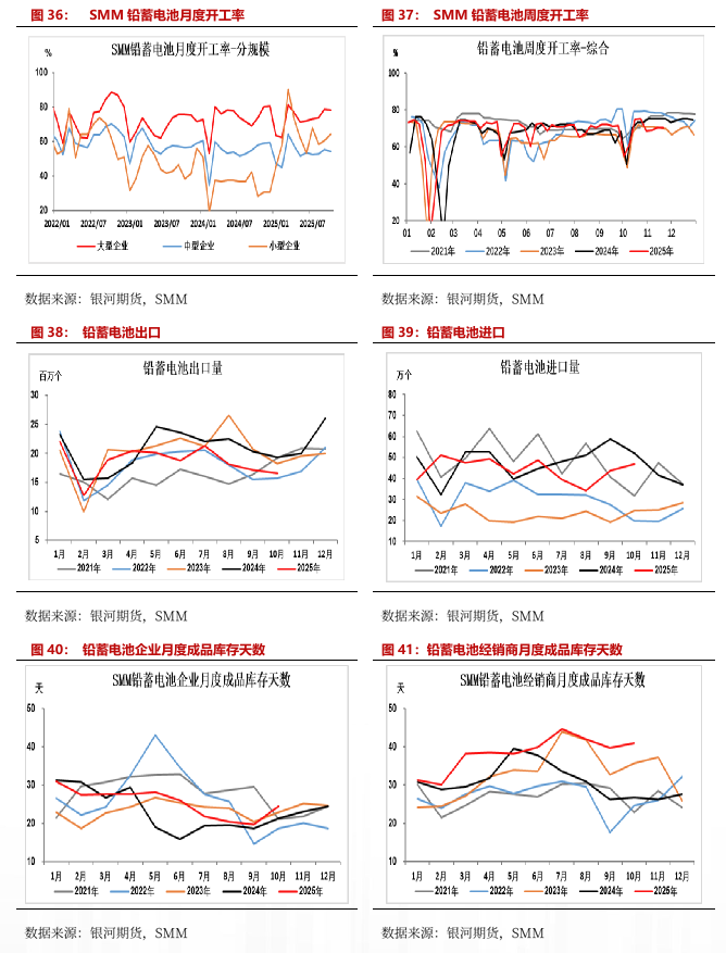 SMM数据显示:10月份全国再生铅企业原料库存为26.23万吨,环比+1.34万吨;成品库存共1.74万吨,较上月-0.06万吨。截至10月31日,再生铅冶炼企业月度原料库存天数高于历史平均值1-2天。但这并不是因废旧铅酸蓄电池市场报废量增加带来的。2025年8月初,铅价刷新近两个月低位,而废旧铅酸蓄电池供不应求且价格居高不下,再生铅冶炼亏损区间扩大出现大面积减停产现象。8月中下旬废旧铅酸蓄电池的价格出现明显回落,并在9月中旬出现阶段性低位;随着铅价震荡上行以及再生铅炼厂的复产进度增加,废铅酸电池的价格才逐步回升。期间,回收商因再生铅炼厂原料报价下调而畏跌出货,回收商废电瓶库存转为炼厂原料库存。综上,10月份再生铅炼厂原料库存缓和,是因回收商出货意愿好转,且冶炼企业因停产对于废旧铅酸蓄电池的库存消化力度下滑。