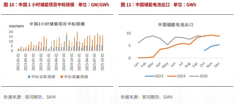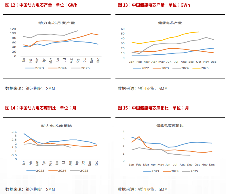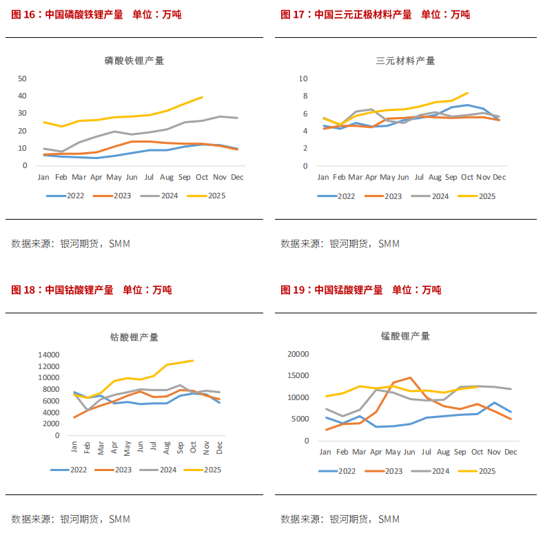 11月排产显示锂电池环比增长1.1%,而磷酸铁锂产能也遭遇瓶颈,部分头部企业已经满产,部分企业有新增产能投放。SMM统计,2025年1-10月磷酸铁锂产量292.9万吨,累计同比增长65%;三元材料产量累计同比增长15%至65.4万吨;钴酸锂产量累计同比增长35%至9.9万吨。11月排产三元正极材料环比增长1.4%;磷酸铁锂环比增长4%,关注实际产量是否符合排产。月底12月排产数据显示电池环比小幅下降,但正极材料环比增加,反映一定补库需求。明年1月需求预期出现一定分歧,储能比较平稳,但动力可能面临淡季需求出现显著下降,需要跟踪12月下旬的排产数据。