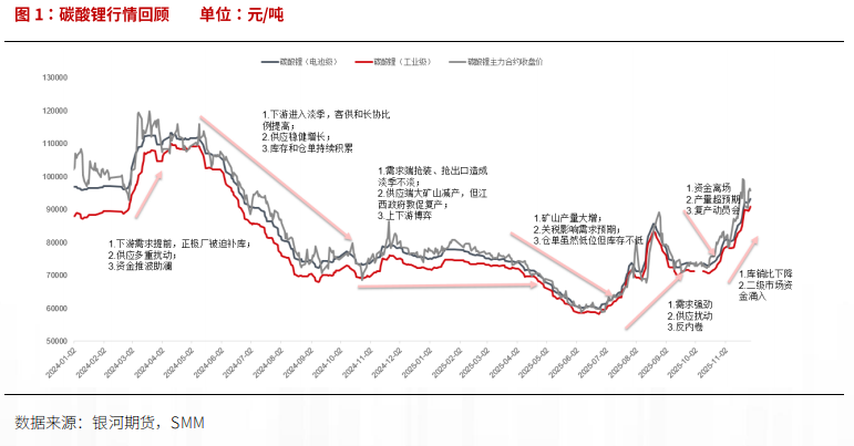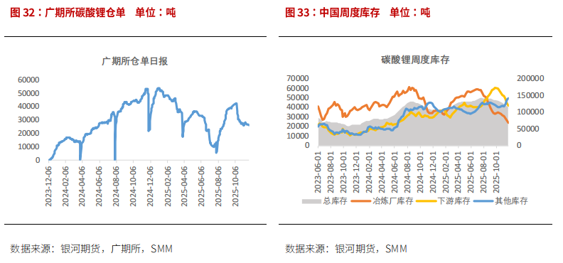 11月20日之前锂价整体是加速上涨的态势。彼时锂电股票如火如荼,市场皆为明年储能成为碳酸锂需求的“第二成长曲线”摇旗呐喊。即使是枧下窝复产进度推进的采矿权出让费公示也被解读为利空出尽。在SMM每周去库3000吨以上且不断加速的背景下,碳酸锂加权持仓增加26.6万手至最高109.3万手,主力合约2601从最低77660涨至102900,涨幅达到32.5%。11月20日交易所监管新规发布,促成锂价见顶回落,11月20日交易所监管新规发布,促成锂价大跌,此后在9-10万之间运行。11月开始的上涨,持仓增加20余万手,涨幅超过30%,终于可以比拟7、8月的两次上涨,不过一半的涨幅由4个交易日实现,且并无实质性利多消息支持,更像是纯粹的资金行为。资金起初集中于2601合约,持仓高达50余万手,被最初监管限制后分散于以2605为主的远月合约,总持仓也一度超过110万手。过去常见的逼仓式上涨,往往也是以严格的监管结束,但若交易逻辑没有变化,监管效果也不明显。11月最后一周,资金重返2605合约,总持仓回到110万手附近,价格补过缺口,需要选择下一步方向。