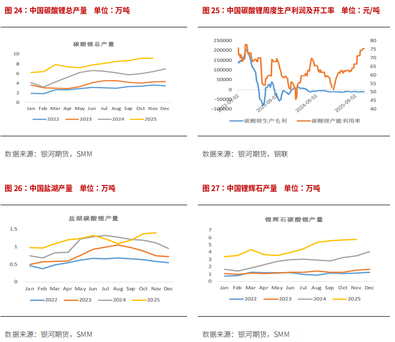 美洲主流矿山锂产量三季度同比减少22.4%,因主要矿山设备故障。Sigma已经复产,AMG故障尚未排除,运行产能仍然低于铭牌产能。2025年产量同比下降7.5%,但2026年若Sigma实现30万吨精矿产量规划,同时完成二期扩建,美洲产量将出现修复式增长。预计2026年产量同比增长22.9%。