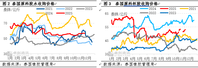 今年开割初期产区物候条件整体正常,顺利开割好于去年同期。但全面开割以后,由于产区雨水偏多,导致割胶工作受阻,新胶上量节奏不及预期。随后受台风“剑鱼”影响,越南中北部、老挝、泰国北部、柬埔寨东部、缅甸中部等地将有大到暴雨,局地有大暴雨或特大暴雨,主产区降雨明显增多或导致新胶上量缓慢,原料收购价格震荡偏强运行,成本端对价格形成有效支撑。步入旺产周期,11月下旬,泰国连日遭暴雨侵袭,南部宋卡府受灾最严重。合艾市是泰国第五大城市及橡胶交易中心。据央视财经消息显示,此次洪灾可能冲击泰国橡胶行业,政府机构预计洪灾或导致橡胶减产约1万吨。新胶产出受阻,支撑原料价格持续处于高挺价位,成本端对价格的底部支撑较为明显。从未来降雨情况来看,伴随着泰国南部降雨减少,新胶上量预期或升温,原料收购价格或大概率呈现高位走弱,成本支撑弱化。