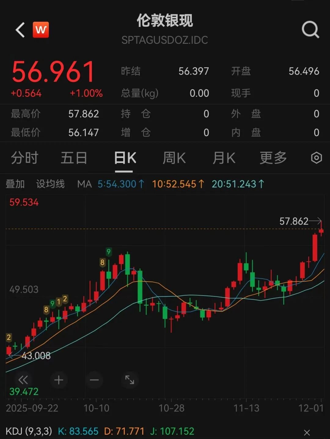 10月中旬,现货白银在创下历史新高后进入高位震荡区间,一度回调至46美元/盎司附近;但自11月起,白银价格开启新一轮上涨周期,从47美元/盎司起步逐步突破50美元关口,11月24日以来更是连续5个交易日收涨,持续刷新历史纪录。