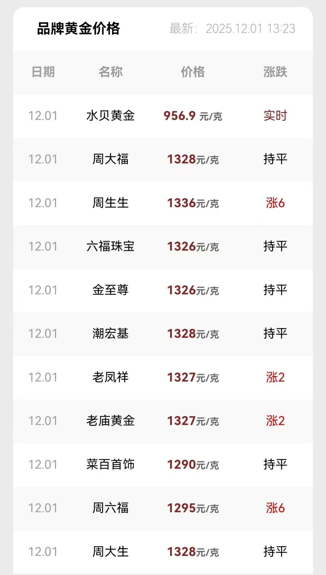 国内市场跟进上涨,实时金价小程序显示,截至12月1日13时23分,水贝黄金价格为957元/克,周大福、周生生、周大生、老凤祥等品牌首饰金克价超1300元,最高克价达1336元/克;资本市场上,黄金ETF及黄金股ETF也同步迎来上涨,资金配置热情持续释放。