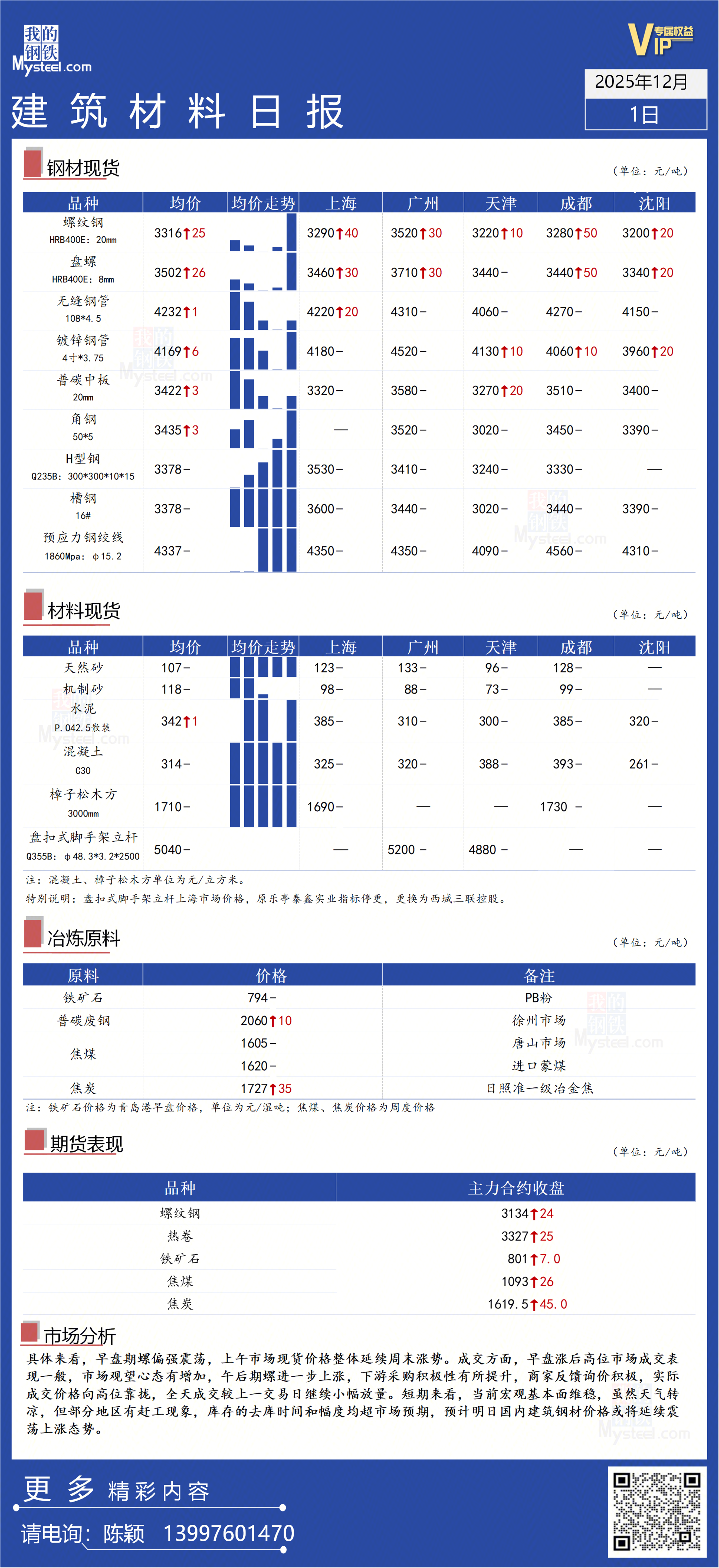 今日螺纹钢HRB400E20mm现货价格为4118/吨,较上一交易日上涨7元/吨。01合约收3693元/吨,较上一交易日上涨2元/吨。05合约收3631元/吨,较上一交易日上涨4元/吨。 今日期螺开盘偏强,现货资源报价维持稳定。就市场成交来看,在盘面走强的推动下,低位资源成交表现良好,价格也逐步上调,但整体需求表现一般。午后期螺继续趋强向上,而成交却明显安静,价格以稳为主,今日螺纹钢价格呈现窄幅盘整。 原料方面,由于当前铁水产量偏高加上钢厂原料库存水平较低,焦炭、铁矿石价格存在支撑,不过由于终端需求未...
