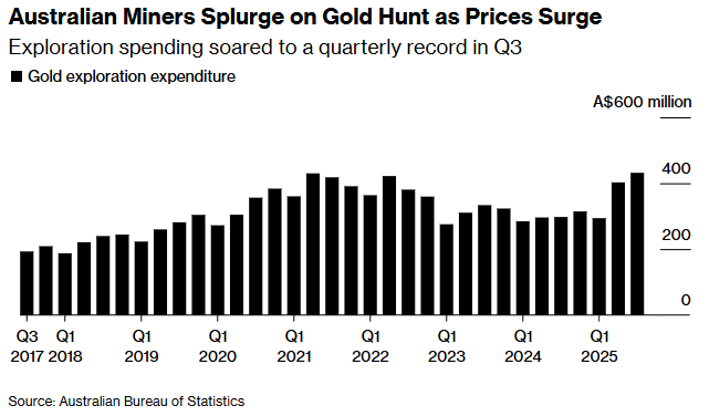 随着今年金价飙升至历史新高,澳大利亚矿业公司正在加大勘探力度,以寻找新的黄金矿藏。根据澳大利亚统计局的数据,在截至9月的三个月内,澳大利亚矿企在勘探上合计投入了4.315亿澳元(约合2.38亿美元),这是自1994年有统计以来的最高季度勘探支出。