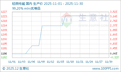 据生意社商品分析系统显示,11月纯碱价格走势上涨,月初轻质纯碱月初市场均价为1186元/吨,月末市场均价1224元/吨左右,月内价格上调38元/吨,涨幅3.20%。