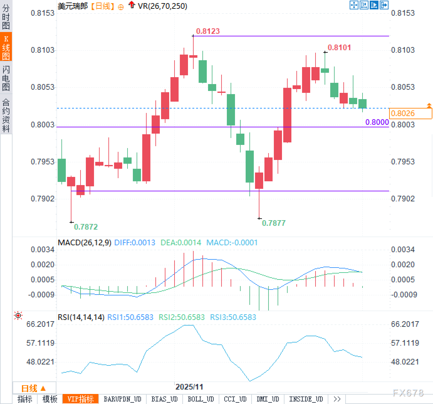 MACD指标在零轴附近粘合,DIFF与DEA几乎重合,柱状线由正转负后逐步缩短,显示前期上涨动能已显著衰减,新趋势方向尚不清晰。RSI维持在50附近震荡,前期偏高水平的回落调整已基本完成,短线既未显著超买也未明显超卖,价格更容易受到宏观消息与美元整体强弱的驱动。综合来看,目前阶段更像是前期涨势后的整理与再平衡区间,后续若向上突破0.8100上方或向下跌破0.8000下方,会被解读为区间边界被打破,从而为后市波动空间提供新的参考。