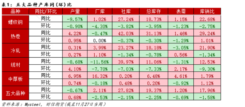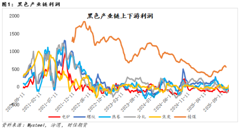 从黑色产业链利润角度来看,黑链上游让利润态势延续。截止11月27日当周,吨精煤利润继续回落;吨焦盈利扩大;以螺纹热卷冷轧为代表的主流钢材品种吨钢即期利润环比都有所回升。考虑到原料煤焦现货正处于补跌当中,短期黑色产业链原料让利仍将持续。