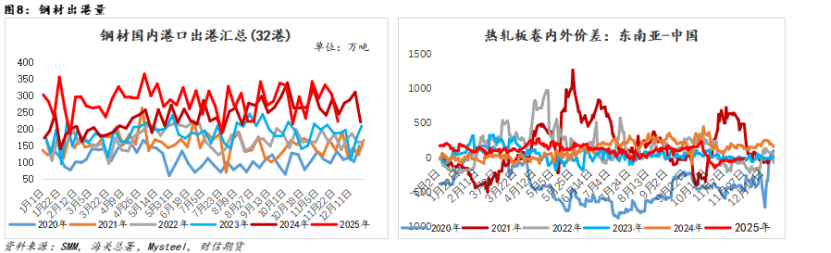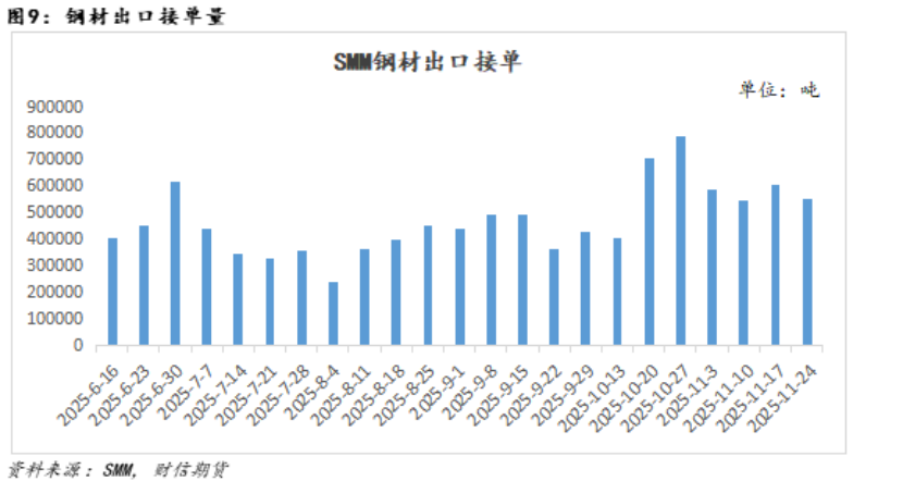 从钢材直接出口角度来看,钢材出港量环比大幅下降,但钢厂接单量尚可,短期钢材出口量或维持弱稳。据SMM,25年第48周,32港钢材出港量为222.26万吨,环比下降83.04万吨。从内外价差来看,截止11月28日,热卷内外价差下降由上周的-10.7回落至-21.4,出口动能有所回落。从钢厂出口接单量来看,样本钢厂钢材出口接单量整体持稳,短期钢材出口继续大幅下降的空间或有限。