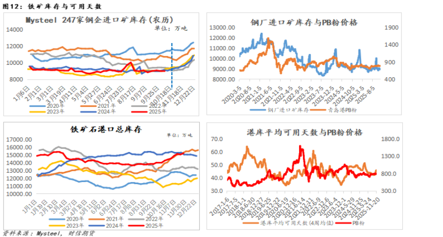 成本:现实承压,但补库预期形成支撑。铁矿方面,港口库存维持高位,但钢厂进口矿库存处于低位。随着补库时点临近,现货价格预计存在较强支撑。煤焦方面,现货仍处降价通道,但焦炭01合约盘面已较充分计价现货提降预期。随着钢厂中旬补库临近,焦煤现货价格有望逐步企稳。综合来看,原料现实支撑有所下移,但后续补库需求预计将增强成本支撑。