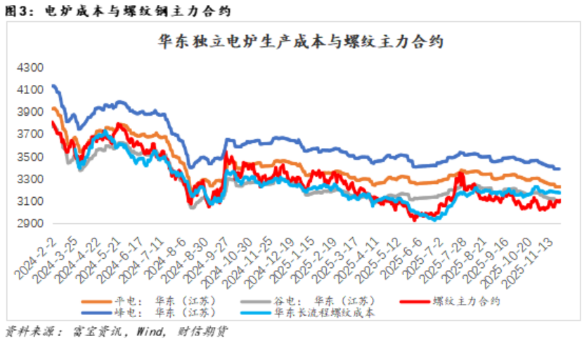 从静态估值来看,螺纹钢主力01合约回升至华东独立电炉谷电成本附近,静态绝对估值中性。据富宝资讯,截止11月28日,华东独立电炉平电生产成本在3231元/吨,华东独立电炉谷电生产成本在3100元/吨(各地区谷电平均平均成本在3111元/吨),华东长流程螺纹钢生产成本在3171元/吨。建材需求逐步进入淡季,现实压力尚存,但进入12月,中央经济工作会议未开之前,宏观预期定价权重或抬升,不排除螺纹01合约估值上移至华东独立电炉谷电成本上方。