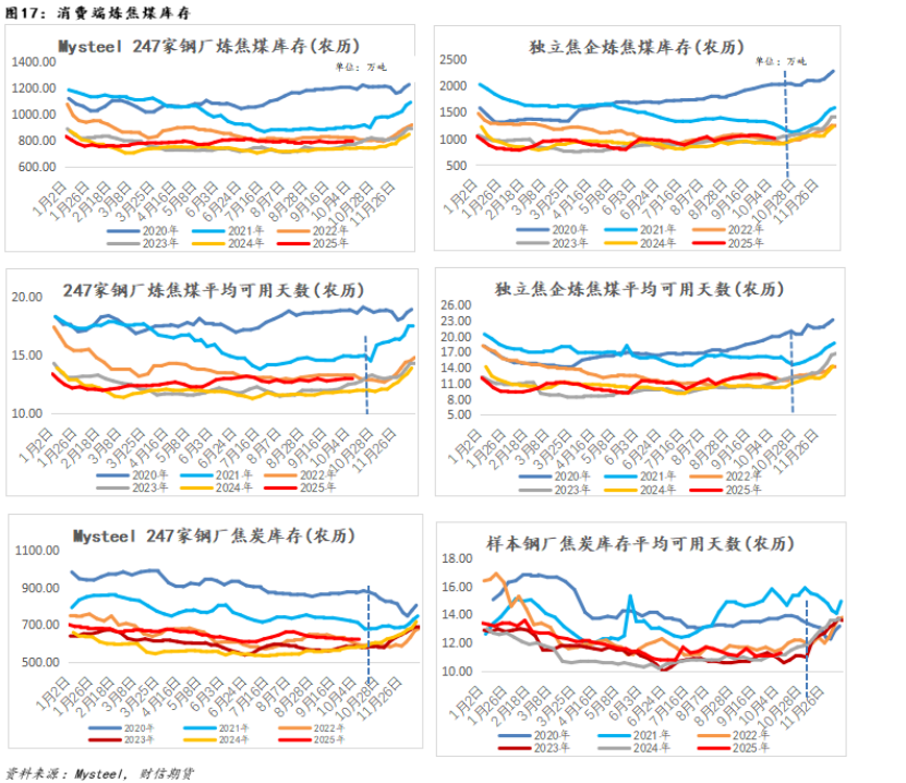 炼焦煤方面,煤矿开工维持小幅波动,下游按需采购为主,煤矿出库不畅(煤矿精煤库存延续累积),现货仍处于降价阶段。据Mysteel调研,截至11月28日,炼焦煤流拍率处于相对高位(连续8个工作日流拍率超过30%)。考虑到宏观预期有所提振,叠加下游补库时点将至(从农历角度来看,一般农历10月底下游开启补库),焦煤现货企稳反弹或已不远。