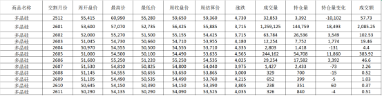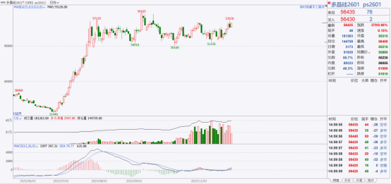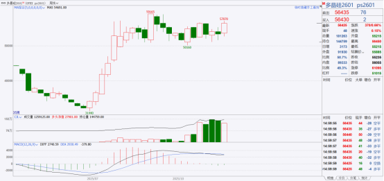 上周多晶硅主力合约ps2601收于56425元/吨,较前一交易周上涨3715元/吨。成交量为1259125手,持仓量为144759手。