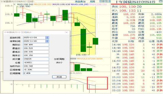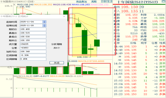 十年国债(T2512)主力合约11月24日(周一)开盘价格108.400点,日K线收出阳线,11月27日(周四)出现本周最低点108.030点,整体趋势是上涨乏力,延续之前回调寻找支撑的走势。