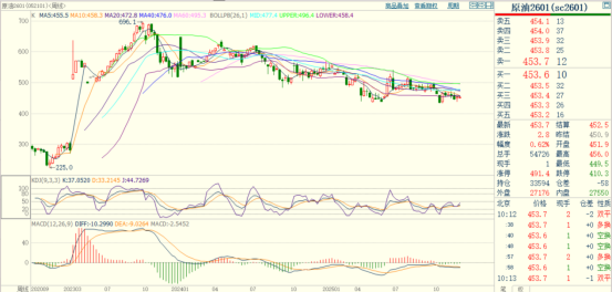 上周原油期货价格企稳回升,主力合约SC2601周度上涨1.45%,收盘报453.9元/桶。周内最高触及455.0元/桶,最低下探438.8元/桶。持仓量较上周减少0.83万手至3.36万手,成交量收缩至45.45万手,显示市场观望情绪仍存。