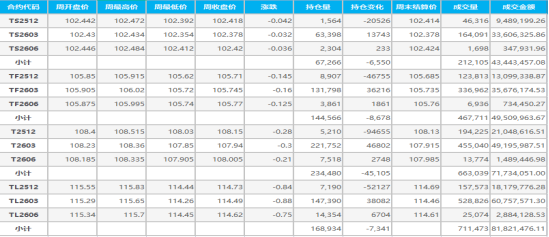 国债期货12个合约,二年国债(TS2512)合约跌幅0.042元,二年国债(TS2603)合约跌幅0.032元,二年国债(TS2606)合约跌幅0.036元,十年国债(T2512)合约跌幅0.28元,十年国债(T2603)合约跌幅0.3元,十年国债(T2606)合约跌幅0.21元,从表格中可以看到所有国债期货合约整体呈现下跌的市场格局。