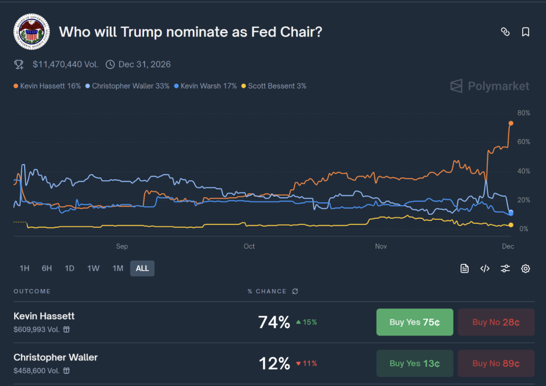 截至目前,Polymarket数据显示,哈塞特获提名的概率高达74%,遥遥领先于其他竞争者。