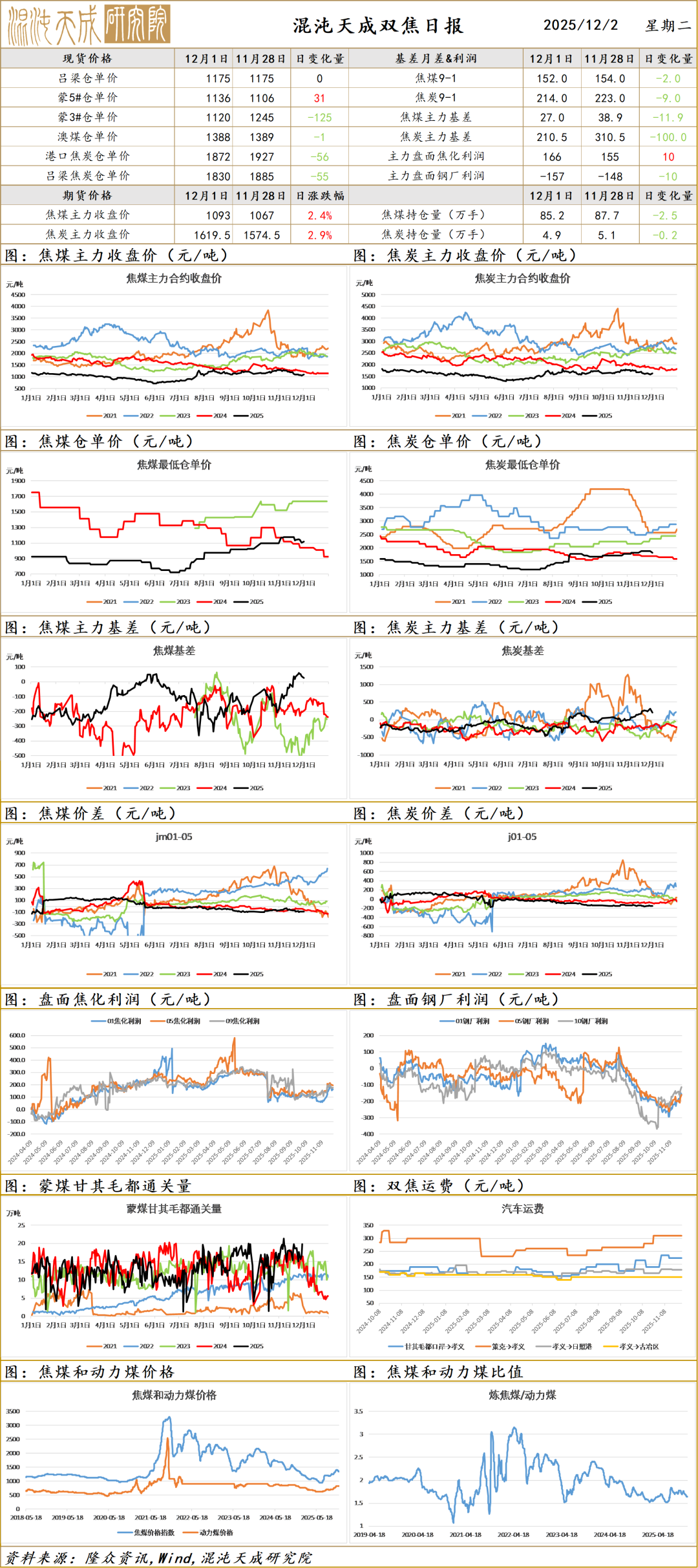 2.中国煤炭资源网冶金部12月1日重点关注:焦炭部分,主流钢厂对焦炭开启首轮提降,本轮降幅50-55元/吨。年底南方钢厂检修计划增多,铁水产量继续下滑,刚需转弱,同时北方钢厂经过前期积极采购,厂内库存水平也有明显提高,而原料煤价格继续加速下跌,焦企利润得到修复,生产积极性尚可,供应端焦炭产量相对稳定,短期焦炭供需呈现偏宽松格局,焦价下行压力较大。焦煤方面,焦炭开启首轮提降,预计本周落地,双焦市场情绪偏弱,下游钢焦企业采购积极性较差,煤矿出货不佳,库存继续累积,煤价整体以下行为主,近日部分煤种有加速下跌趋势,短期市场预计偏弱运行,后期关注下游补库节奏和煤矿生产情况。进口蒙煤方面,甘其毛都口岸通关延续高位运行,监管区库存增至280万吨以上水平,贸易商心态偏弱,蒙煤价格延续跌势,蒙5#原煤成交价已降至970-990元/吨左右。