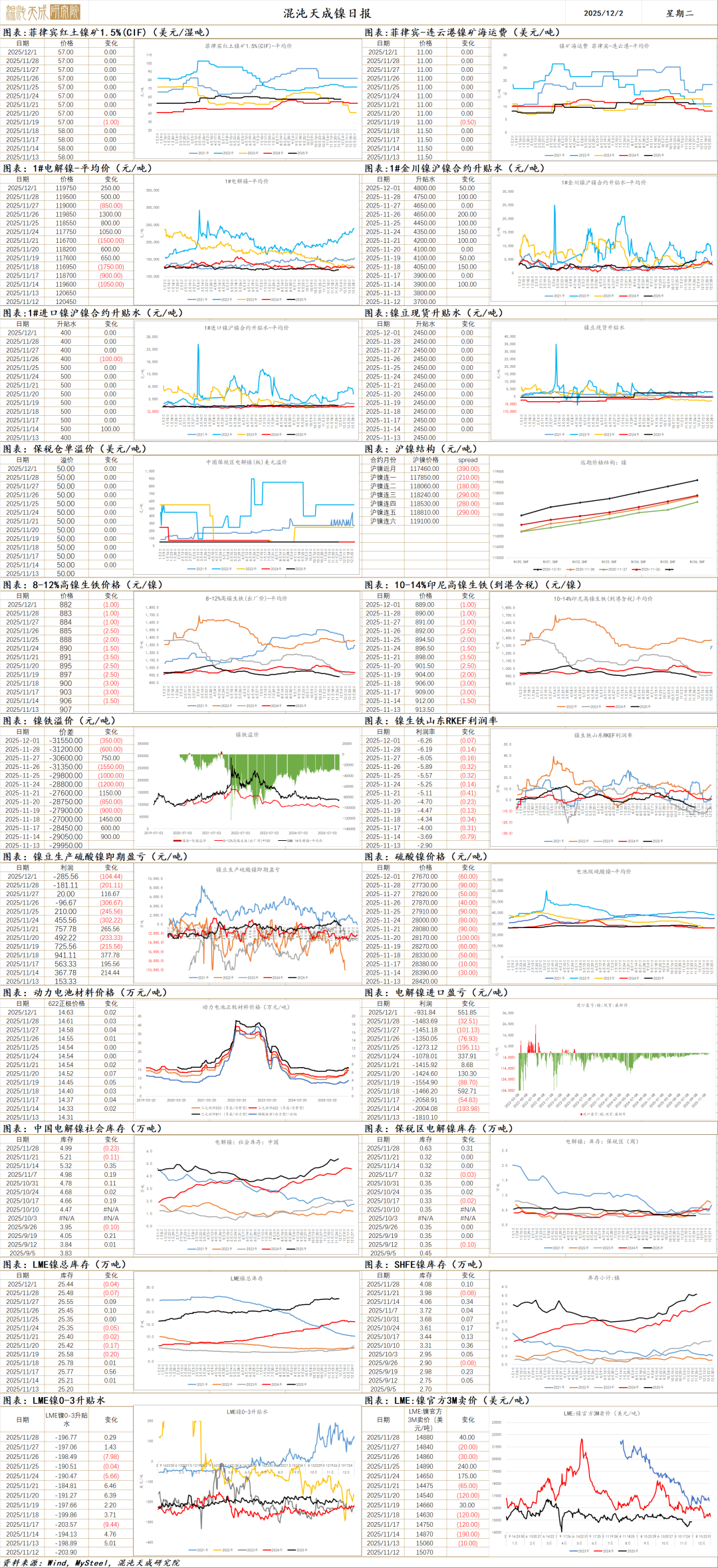 1、【市场现货趋紧精炼镍社会库存略有累库】据Mysteel调研统计,截至2025年11月28日中国精炼镍27库社会库存增加1572吨至54716吨,增幅2.96%;仓单库存减少476吨至33309吨;现货库存增加2048吨至17637吨,其中镍板增加2048吨,镍豆持平;保税区库存持平至3770吨。上周镍价止跌回升,精炼镍生产企业四季度多有减产,精炼镍市场现货趋紧,社会库存小幅抬升。(文华财经)
